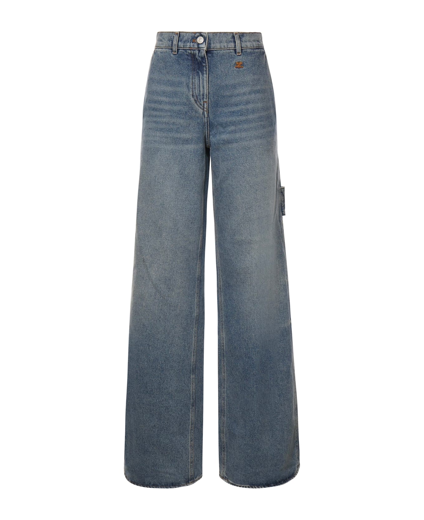 - Made of cotton denim - 5 pockets - Belt loops - Wide leg - Size shown is 26 - Designer color: Denim Blue