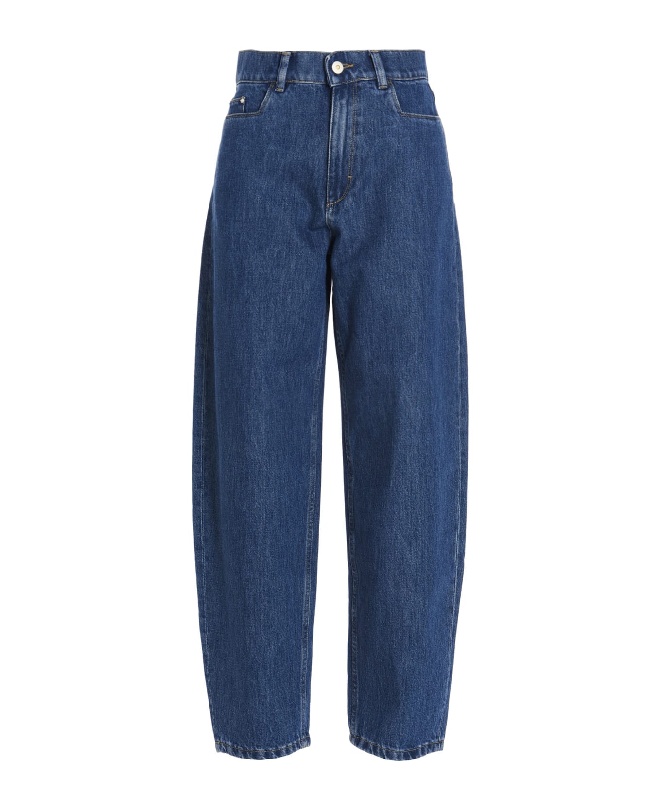 'Chamomile' cotton denim jeans with zip and button fly, five pockets, balloon leg and leather loop details on the back.