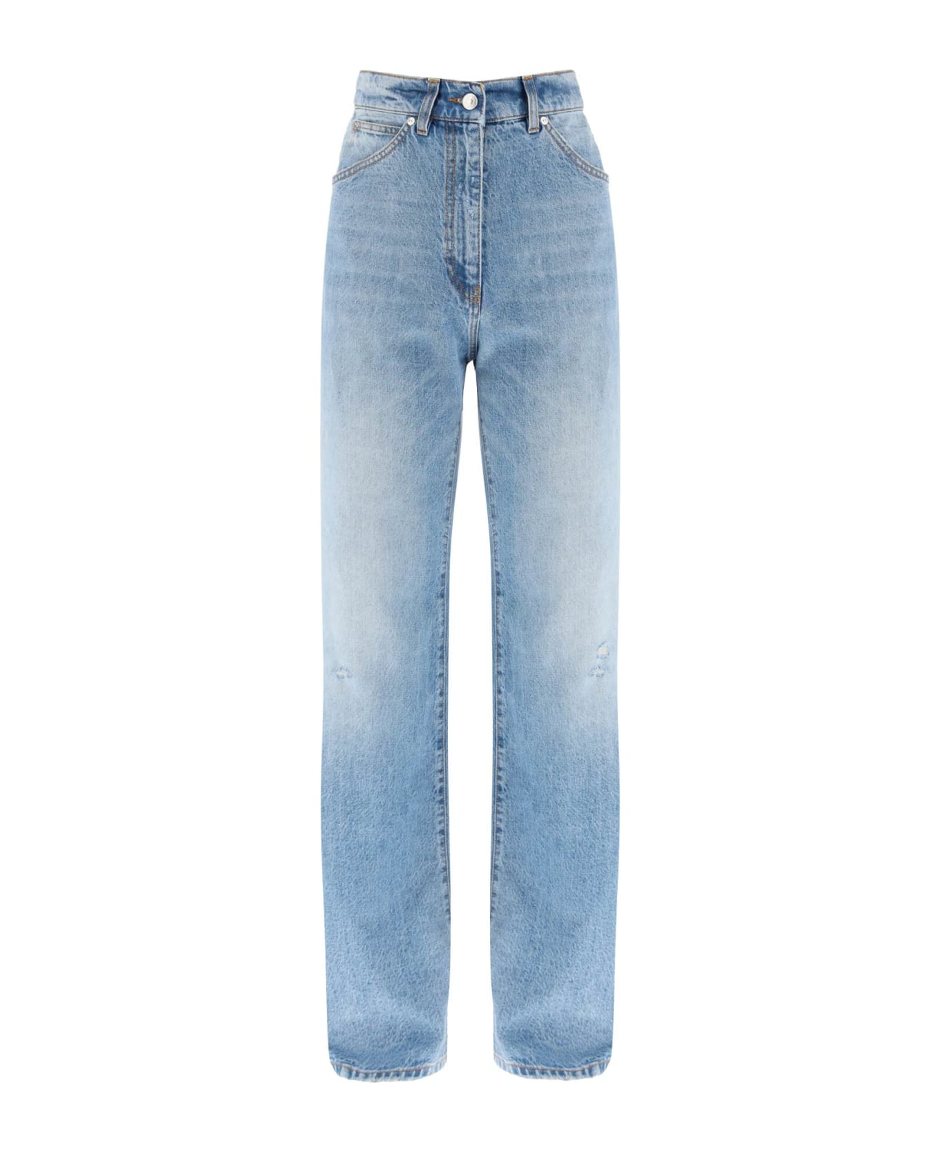 MSGM high-waisted jeans in distressed cotton hemp denim with a five-pocket design. Cut to a baggy fit with wide leg, they are finished with contrast stitching, belt loops and zip fly with top button. The model is 177 cm tall and wears a size IT 38.
