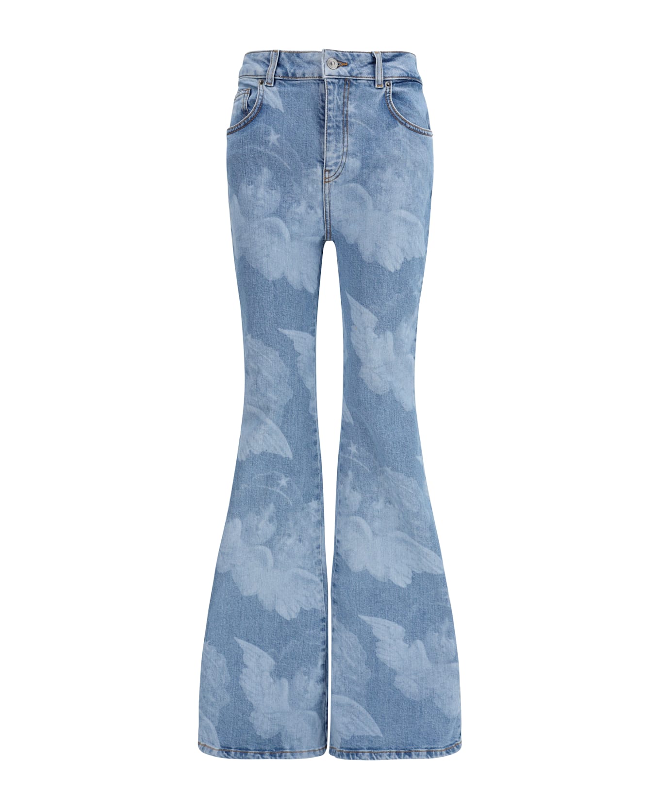 The flare skinny angel-print jeans by fiorucci combine a feminine, streamlined silhouette with the brand s iconic aesthetic. made in italy, they feature a high-rise waist and a slim leg that flares at the hem, creating a balanced and dynamic shape. the classic five-pocket design, belt loops, and button-and-zip closure maintain traditional denim construction, while the angel print adds a distinctive and recognizable touch, making them perfect for bold casual looks.