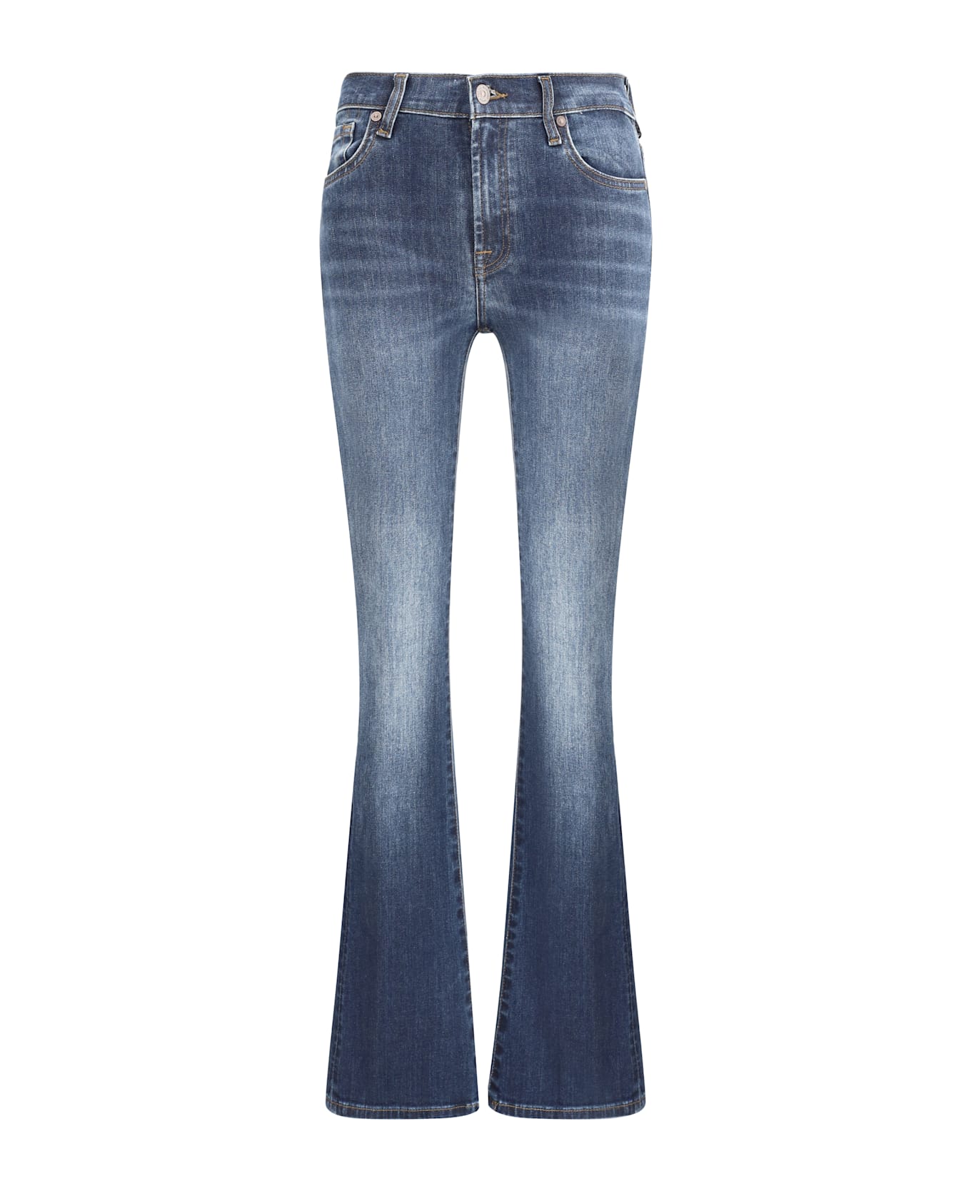 The gran canyon jeans by 7for are a five-pocket bootcut style with a zipper-and-button front closure. the high waist enhances the figure, while belt loops on the waistband offer a customizable fit. the bootcut cut, which flares slightly from the knees toward the bottom, creates a balanced, refined silhouette perfect for a sleek, modern look. a versatile garment that combines comfort and style.