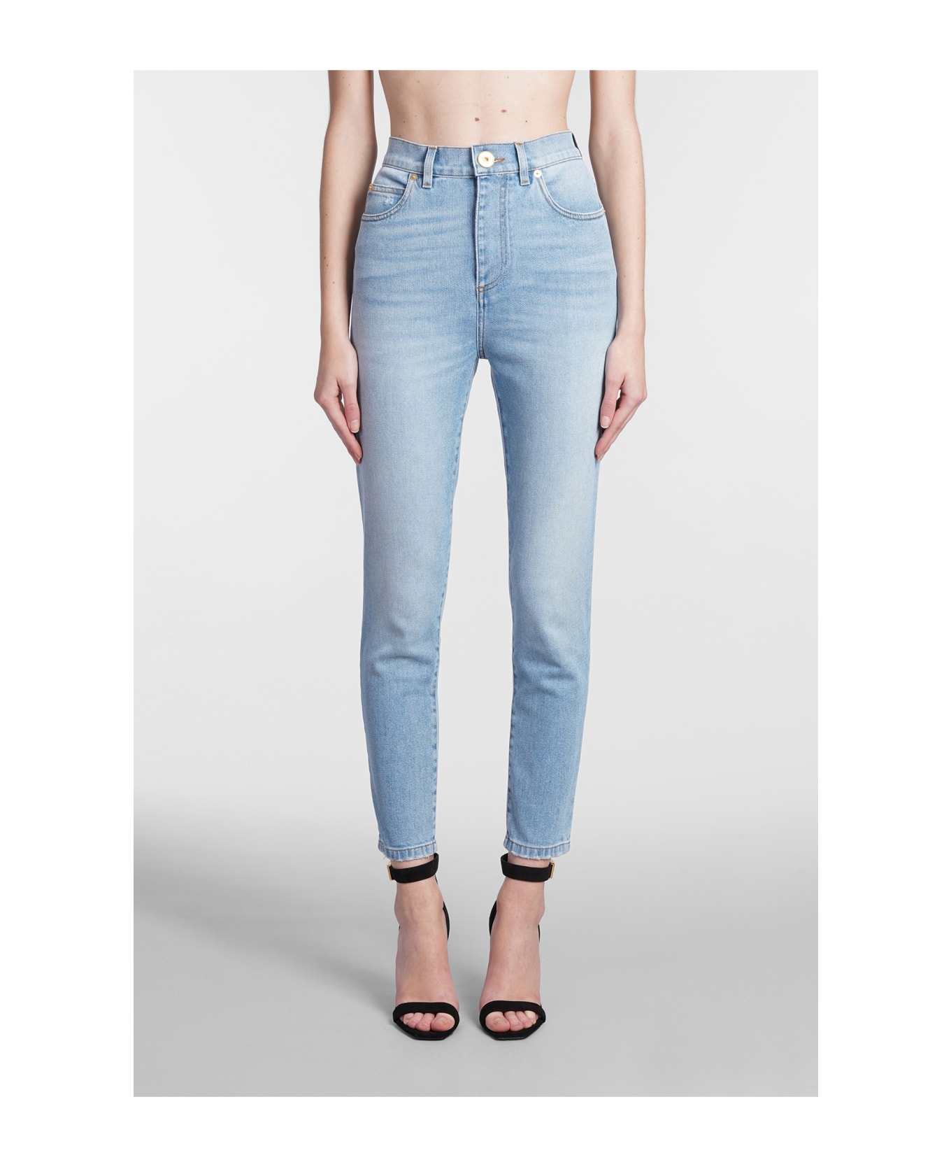 Jeans in cyan denim, button and zip closure, five pockets, waist belt loops, slim fit, 98% cotton 2% elastane, Made in Italy, Model is 180 cm and wears 36