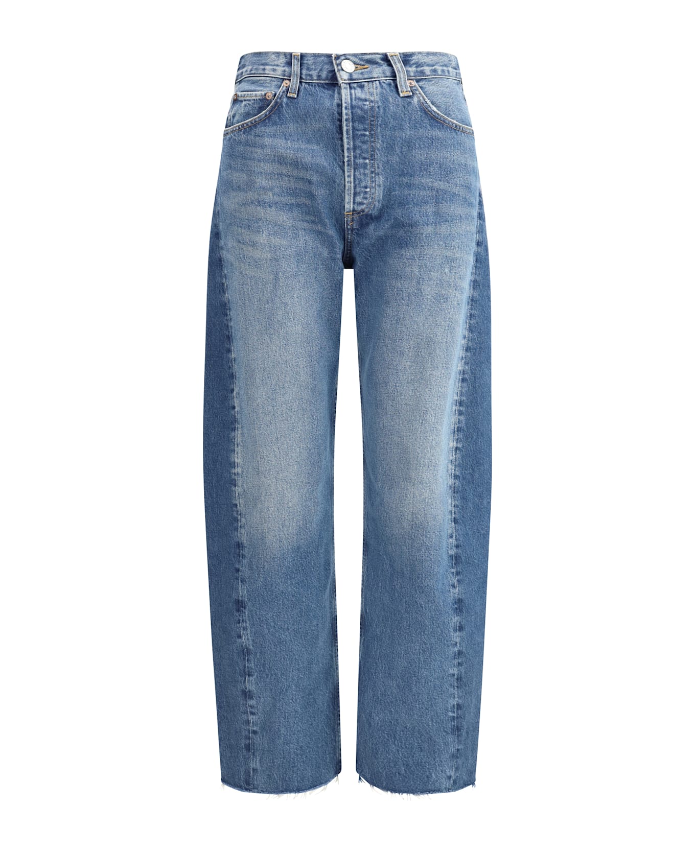 Agolde's luna pieced jeans are a garment with a contemporary and original design. the model is straight, but features a slight balloon shape at the bottom, which adds a modern and dynamic twist to the traditional cut. the five-pocket design is a classic, while the front button and zipper closure offers uncompromising practicality. belt loops on the waistband allow you to customize the look, while the raw cut detail on the bottom gives the jeans a raw effect, perfect for those looking for a more urban, gritty look.
