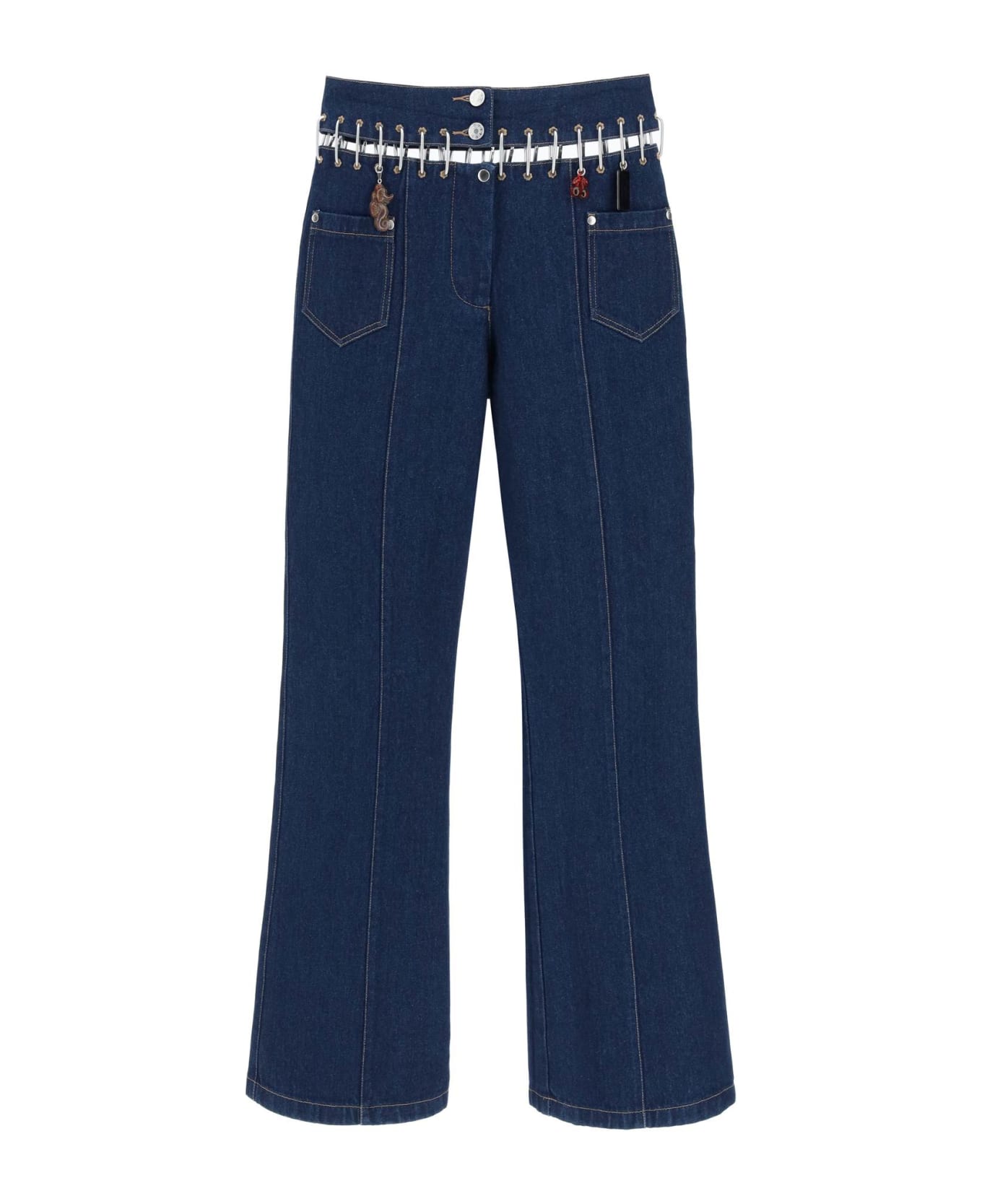 Organic cotton denim jeans by Chopova Lowena in a high-waisted flared cut, featuring snap hooks that join the waistband to the rest of the garment, concealed zipper and button closure and four patch pockets. Decorated with contrasting stitching and charms on the front. The model is 177 cm tall and wears size S.
