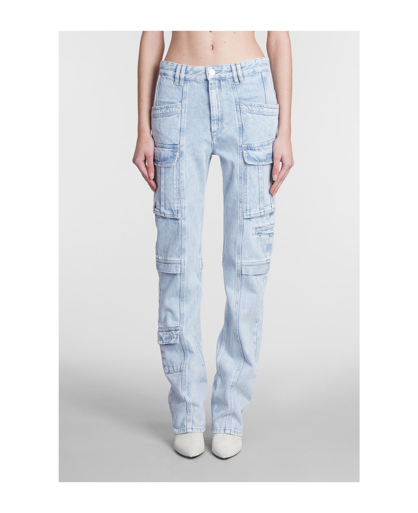 Vokayo Jeans in blue denim, button and zip closure, waist belt loops, cargo pockets, 100% cotton, Model is 180 cm and wears size 34