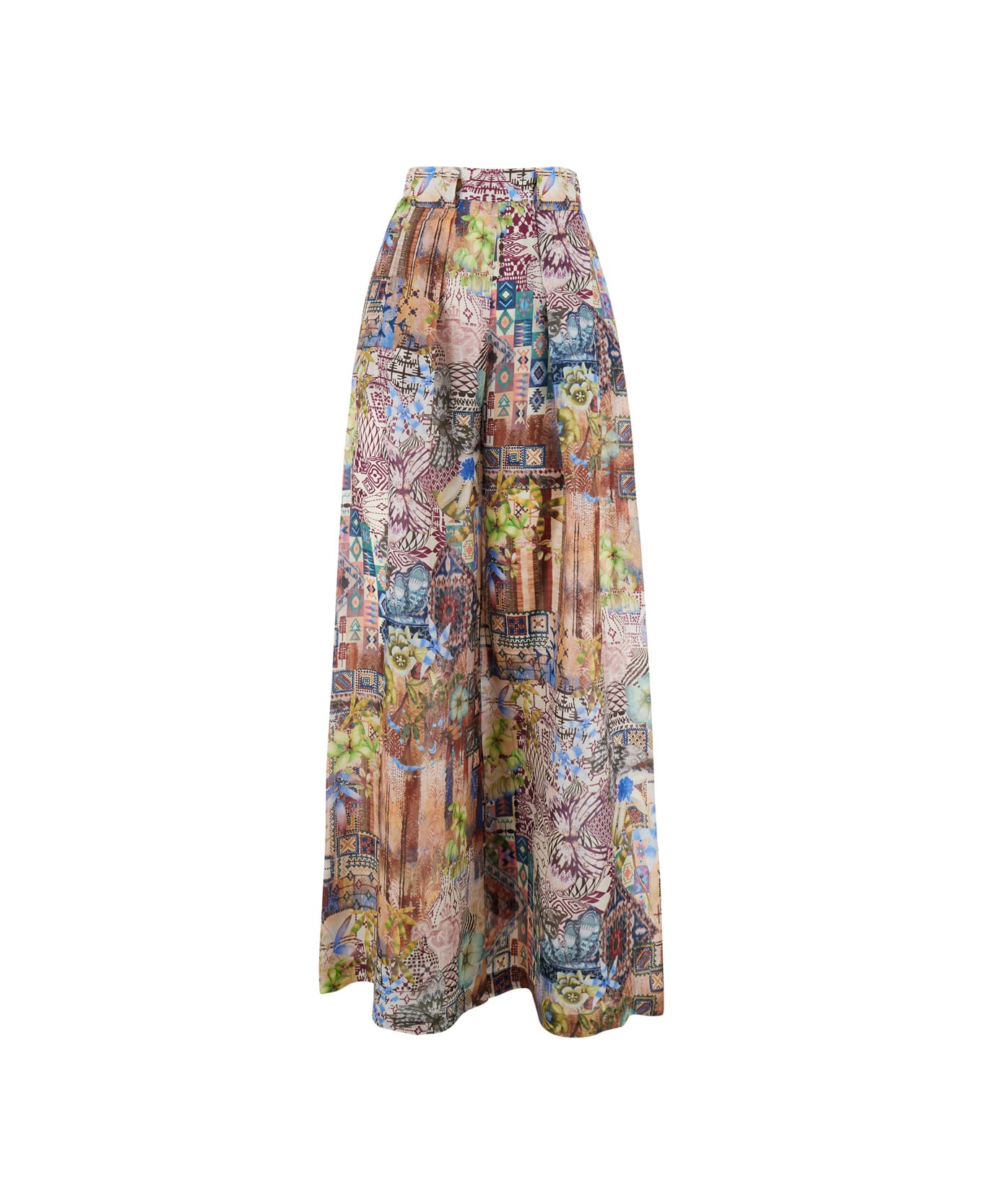 Multicolor 'ASPEN PANT' pants with a high waist and a front zip and hook closure. They feature side pockets and a wide design that flows down the legs. The back is characterized by welt pockets. Made of Silk. Regular fit.