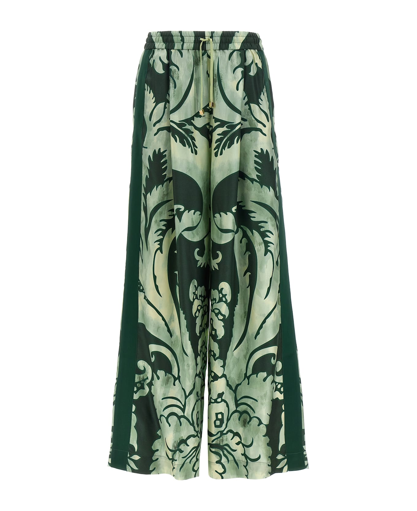 'Asteria' pants in silk twill with all-over floral print, wide and straight leg, elastic with adjustable drawstring at the waist, front pleats, tone-on-tone grosgrain bands on the side, pockets.