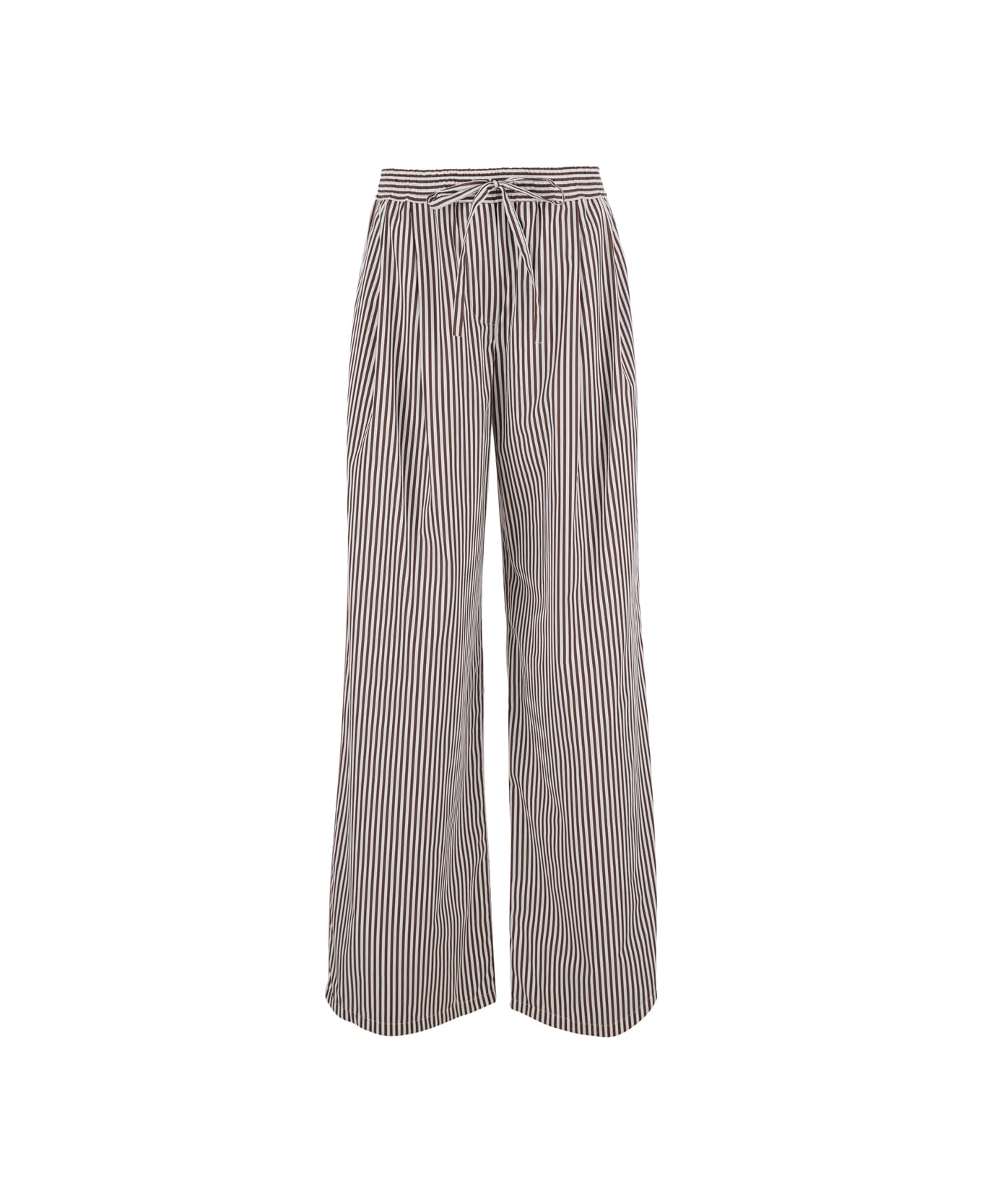 Brown striped pants with an elastic waistband that ensures a comfortable fit. They feature side pockets and embroidered details on the front. The back is characterized by welt pockets. Made in Tech Fabric. Regular fit. Composition: