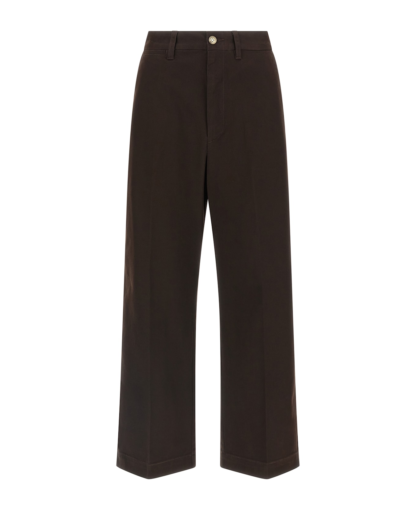 Stretch cotton twill pants, crop chino, flared wide leg, expanded pleat, zip and front button closure, pockets.