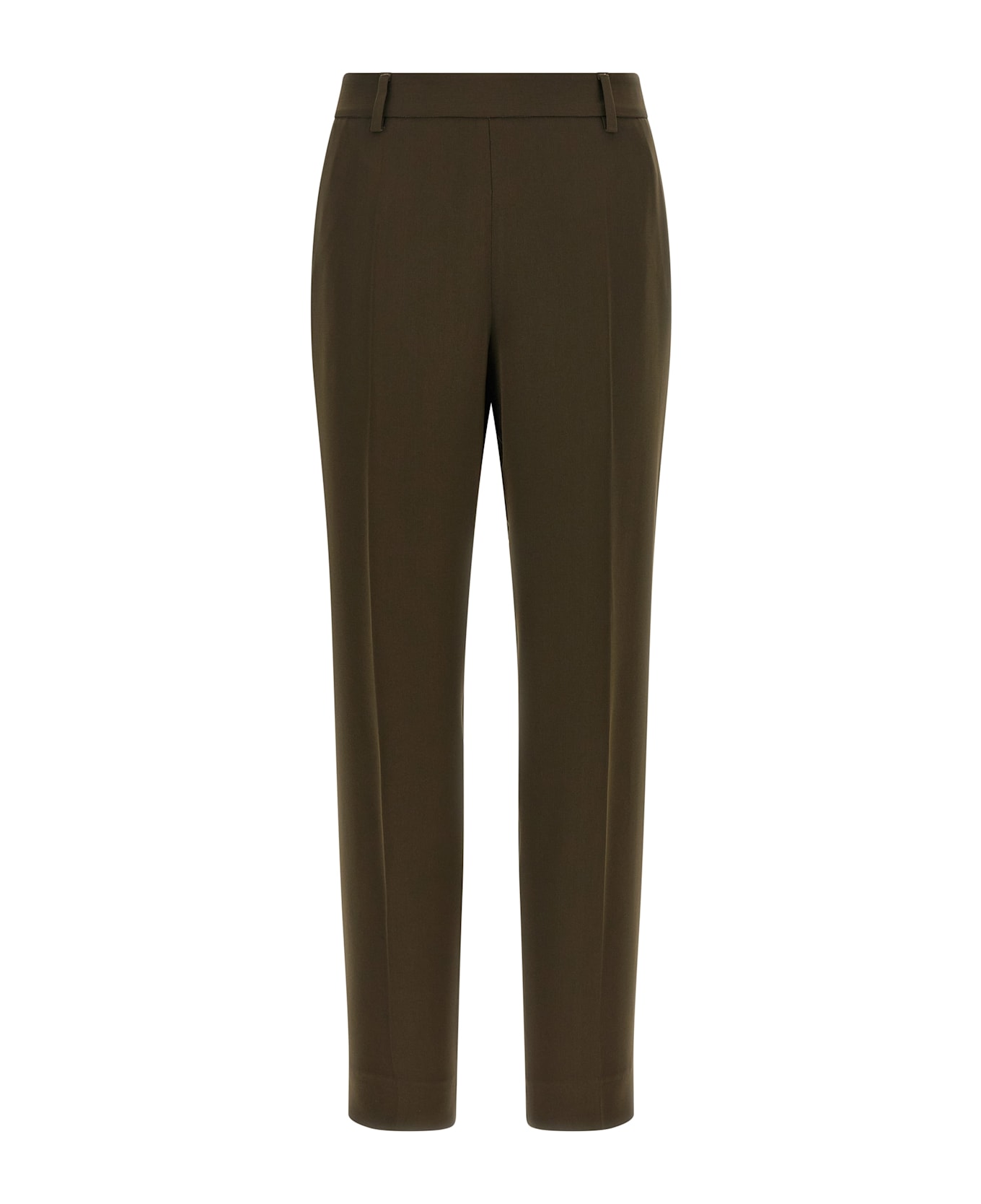 Crepe pants, straight leg, stretched pleat, elastic back waistband, side zip closure, front American pockets, back welt pockets. Composition: 70% triacetate 30% polyester