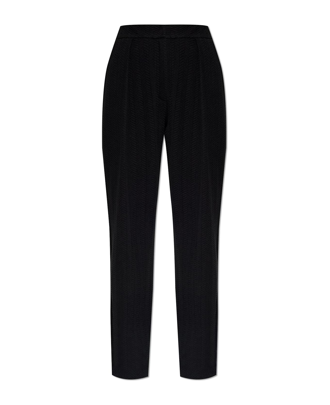 Introducing the Herringbone Patterned Pants by Emporio Armani a timeless masterpiece tailored for true connoisseurs of style. These high-waisted pants feature a gently tapered silhouette, meticulously fitted at the waist with a refined concealed band, while the legs drape effortlessly for an elongated, elegant profile. Crafted from a sumptuously textured, matte-finished fabric in deep black, the distinct herringbone motif lends a striking depth and sophistication. Subtle darting ensures a perfect contour to the body, while the front features a pressed crease for a polished finish. Free from ostentatious logos, every detail speaks to a philosophy of discreet luxury. Why choose this product? Exclusive herringbone pattern for a sophisticated touch Precision tailoring ensures an impeccable fit Luxurious material blends comfort with enduring elegance Signature minimalism from Emporio Armani's heritage Ideal for elevating both formal and contemporary ensembles