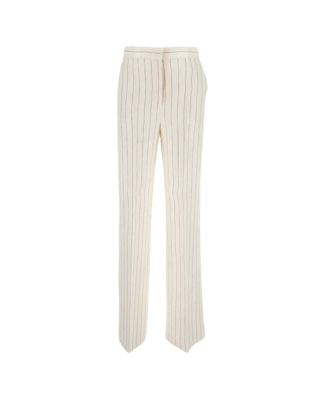 White Popoli Pinstriped Linen Trousers from Max Mara Max Mara Popoli trousers in white linen Batavia with brown pinstriped motif, mid-waist, concealed zip and double hook closure, slanted pockets, raw hems, wide-leg and ironed creases.