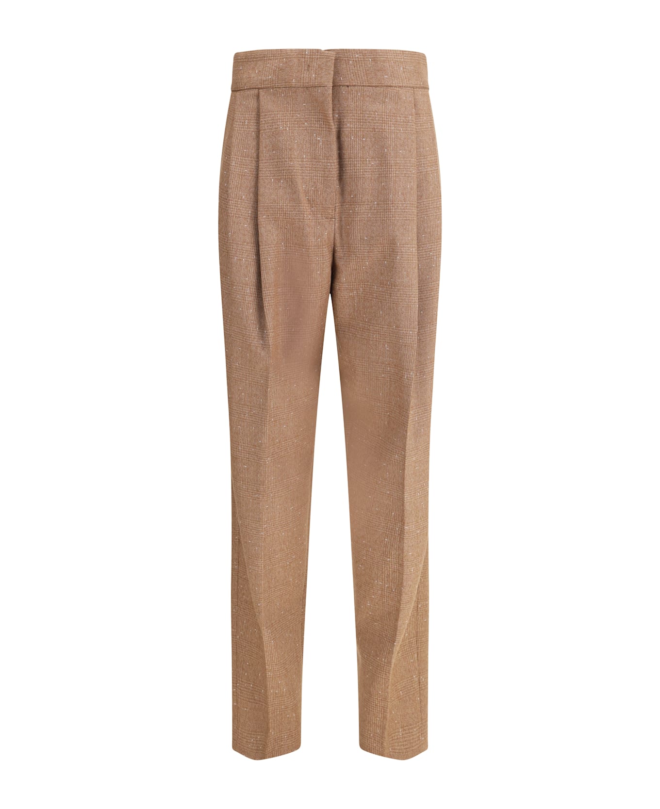 Fabiana filippi's prince de galles pants express classic elegance revisited with modern and sophisticated details. made of a fine prince of wales slub fabric with a silky smooth surface, they combine comfort and sophistication in a garment designed to stand out. the front darts enhance the silhouette, while the diamond thread loop detail adds a bright and distinctive note, typical of fabiana filippi style. completing the design are the high waist, straight leg, zip-and-hook closure, and belt loops at the waist, perfect for pairing with thin belts or sophisticated accessories.