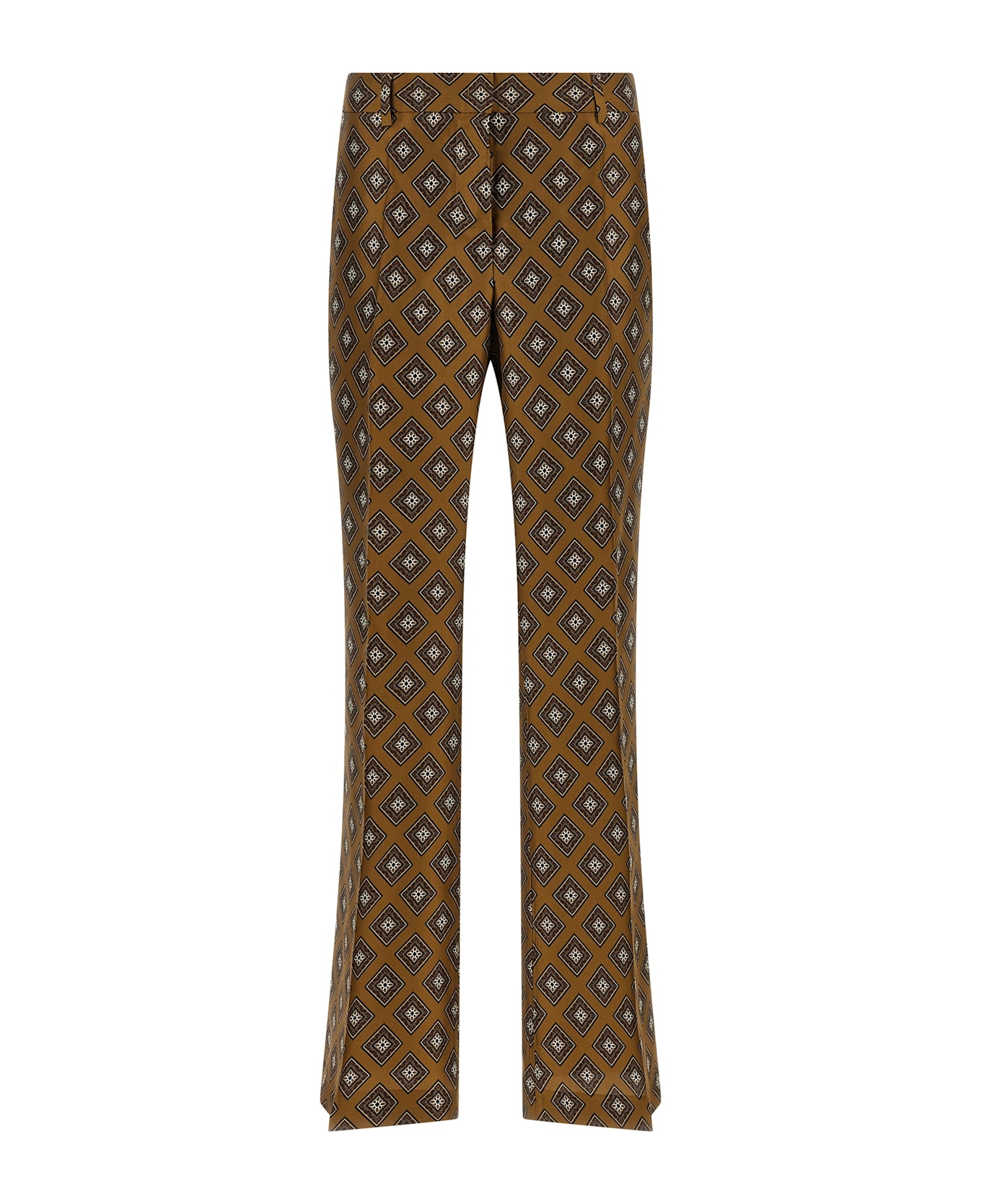 All-over tie-print silk twill pants with flared leg at the bottom and front stretched pleat, zip and hook closure, side pockets and back welt pockets.