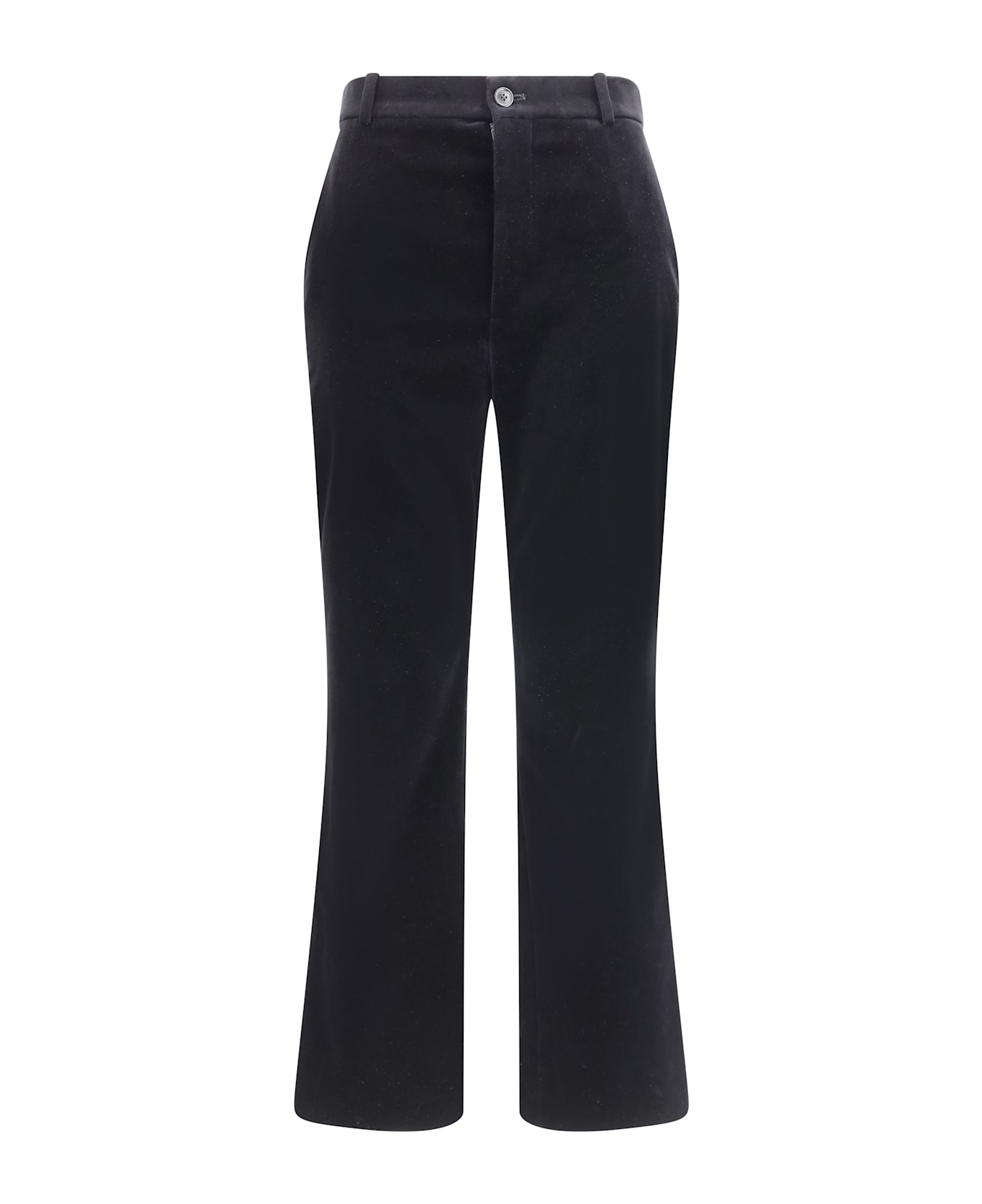 Velvet pants by saint laurent combine sartorial elegance with sophisticated texture. made of certified cotton, they feature a mid-rise waist and a straight leg defined by a center crease that enhances their clean lines. featuring a button and front zipper closure, they offer two slanted front pockets, two profiled back pockets and belt loops at the waist. a classic and refined garment perfect for formal or sophisticated casual looks.