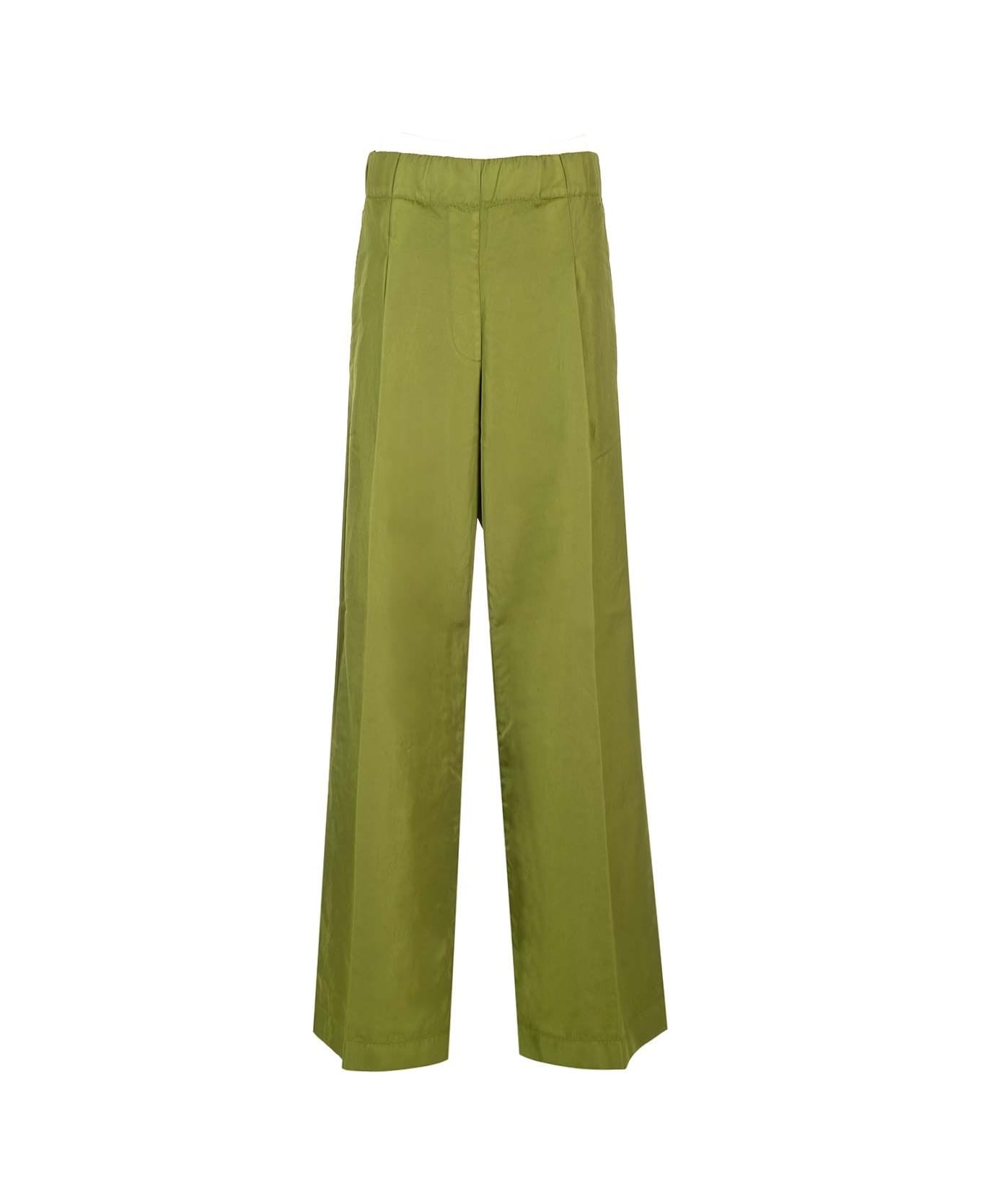 Water-repellent grass green nylon trousers from Dries Van Noten, palazzo style with elasticated waist, side welt pockets and a flat back pocket with button.