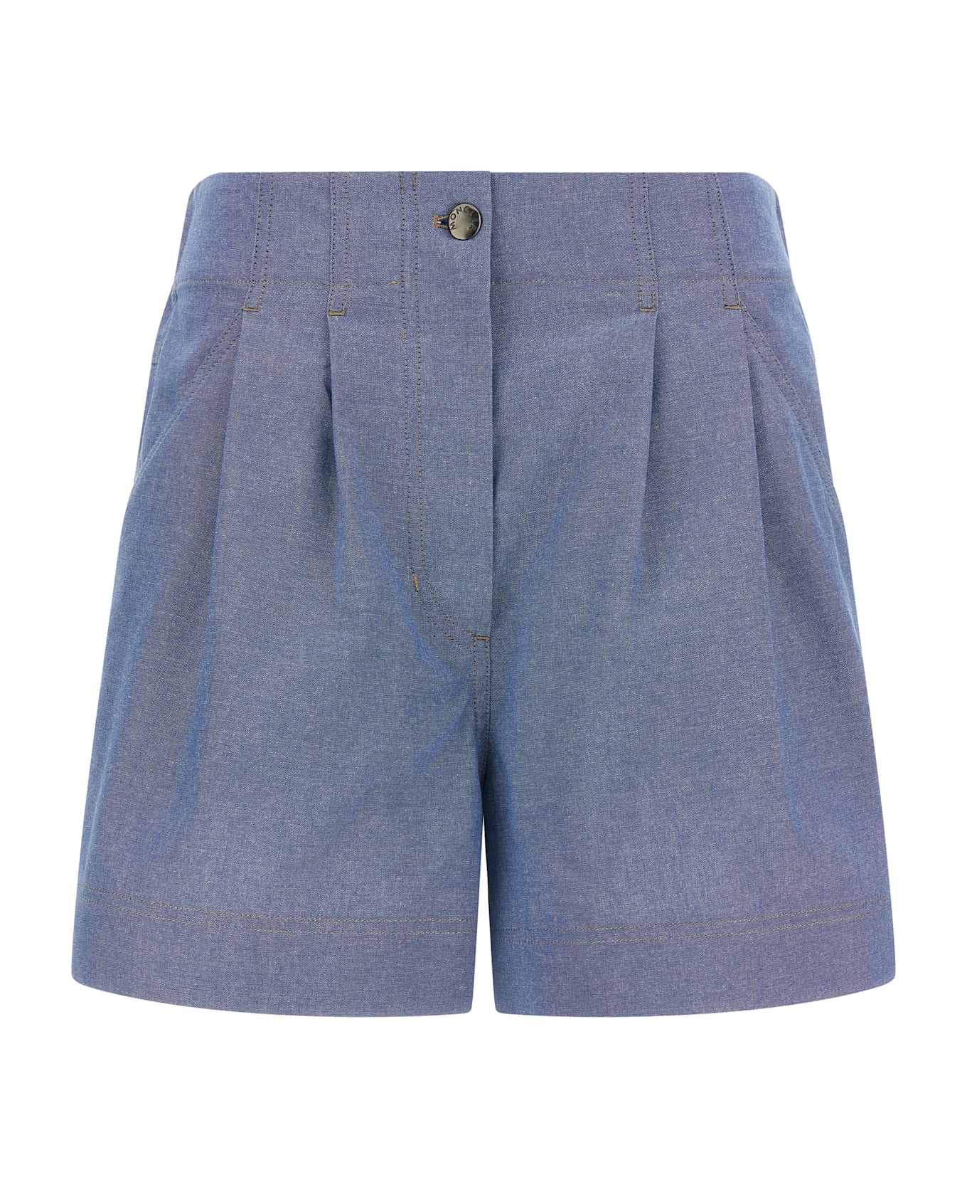 Chambray cotton shorts, breathable micromesh lining, contrast stitching, elastic waistband at the back, front zip and snap button closure, pleats, wide leg, pockets, back logo patch. Composition: 100% cotton