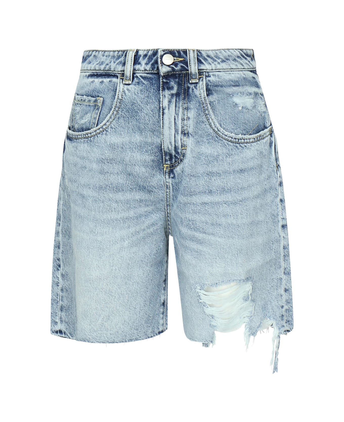 -Made of denim -Functional pockets -Wide leg -Mid-rise -Rip on the leg -Zip and button closure -Belt loops -The size shown in the photo is 25 -Color: Light blue