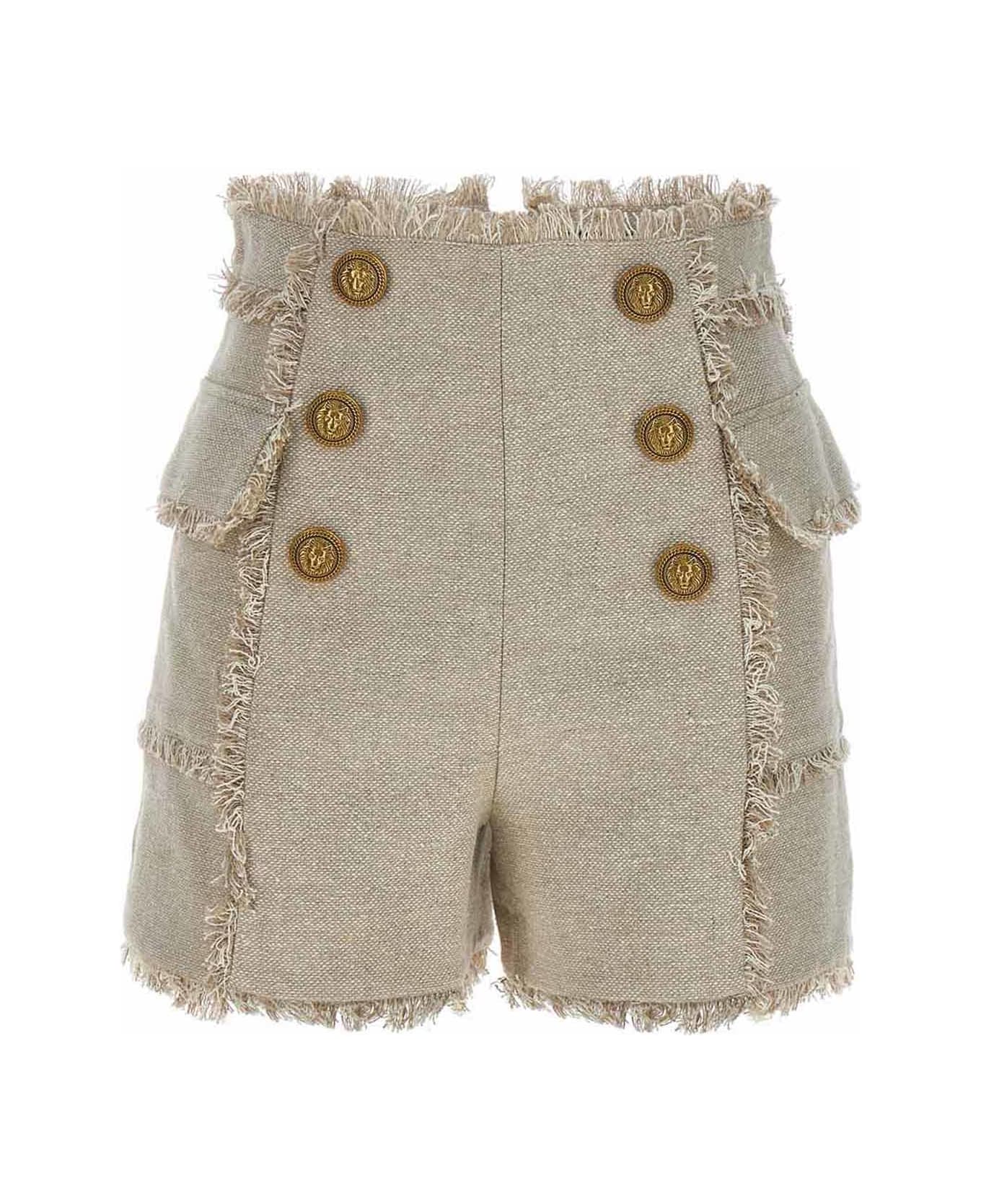 Linen canvas shorts with fringe detail, gold button appliqués, pockets and a back zip closure. Composition: 78% linen 22% silk