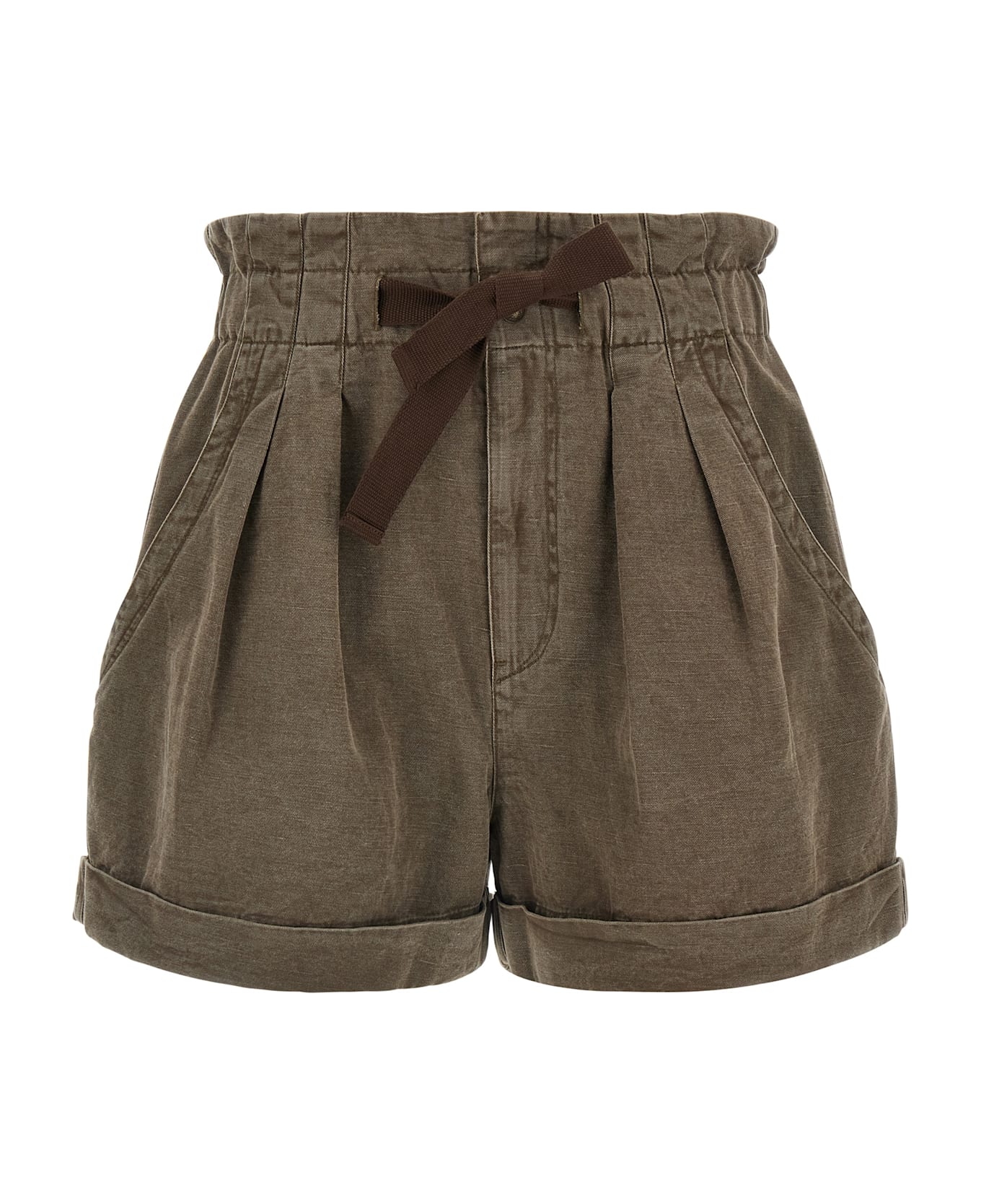 'Nirma' cotton canas, crinkled at the waist with elastic and front knotted drawstring, zip and snap closure, pin tucks at the waist, wide leg with turn-up at the bottom, oblique side pockets.