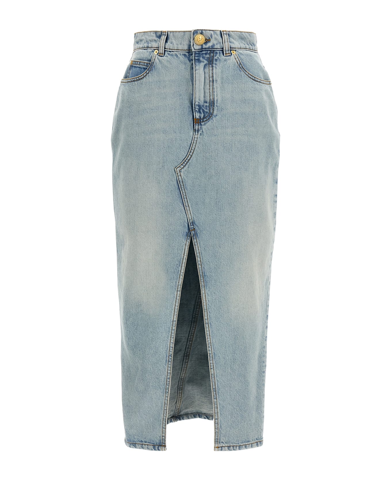 Midi skirt in delavé cotton denim with front split, high waist model, zip and 'Leone doppia catena' button closure, five pockets, back logo tag. Composition: 100% cotton