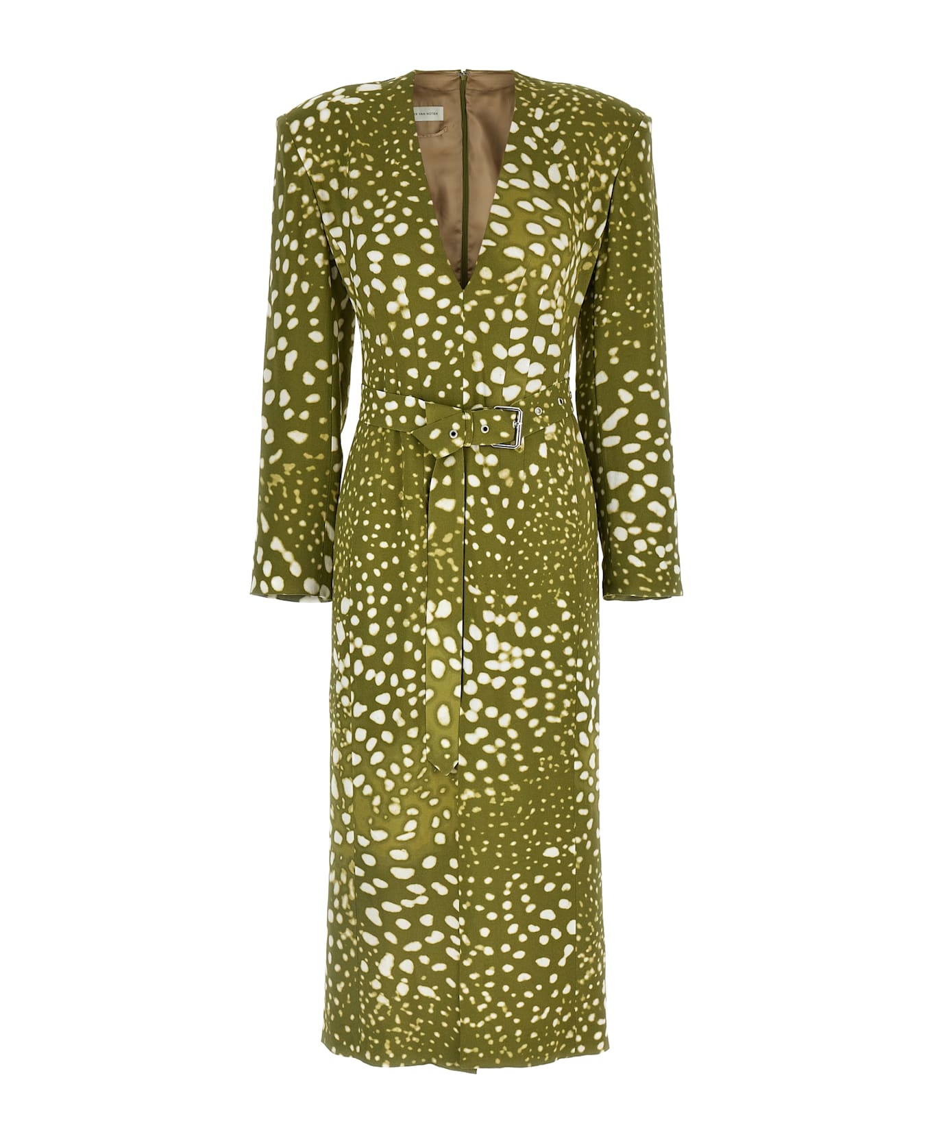 'Dohana' dress in printed viscose with deep front V-neck, long sleeves, padded shoulders, front split, back zip closure, lining.