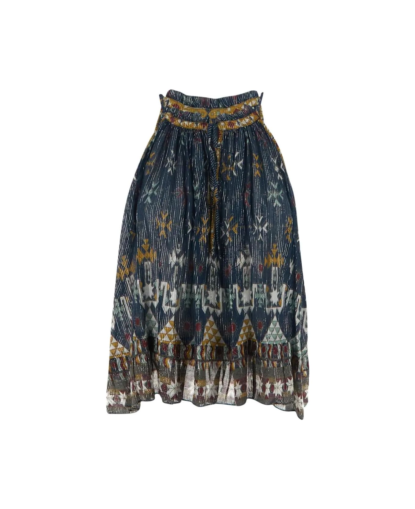Isabel Marant Etoile Fabino top in teal cotton with multicolor print, round neck with self-ties, sleeveless, a ruffled hem detail and loose fit.