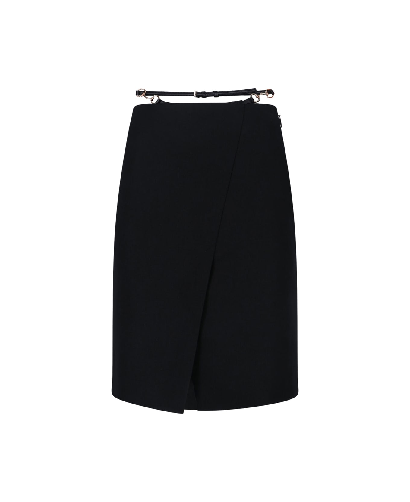 Gucci "horsebit" black wool midi skirt with mid waist, back zip closure, belt at the waist with metal "horsebit" details, back slit, straight hem. Composition: 100% Wool