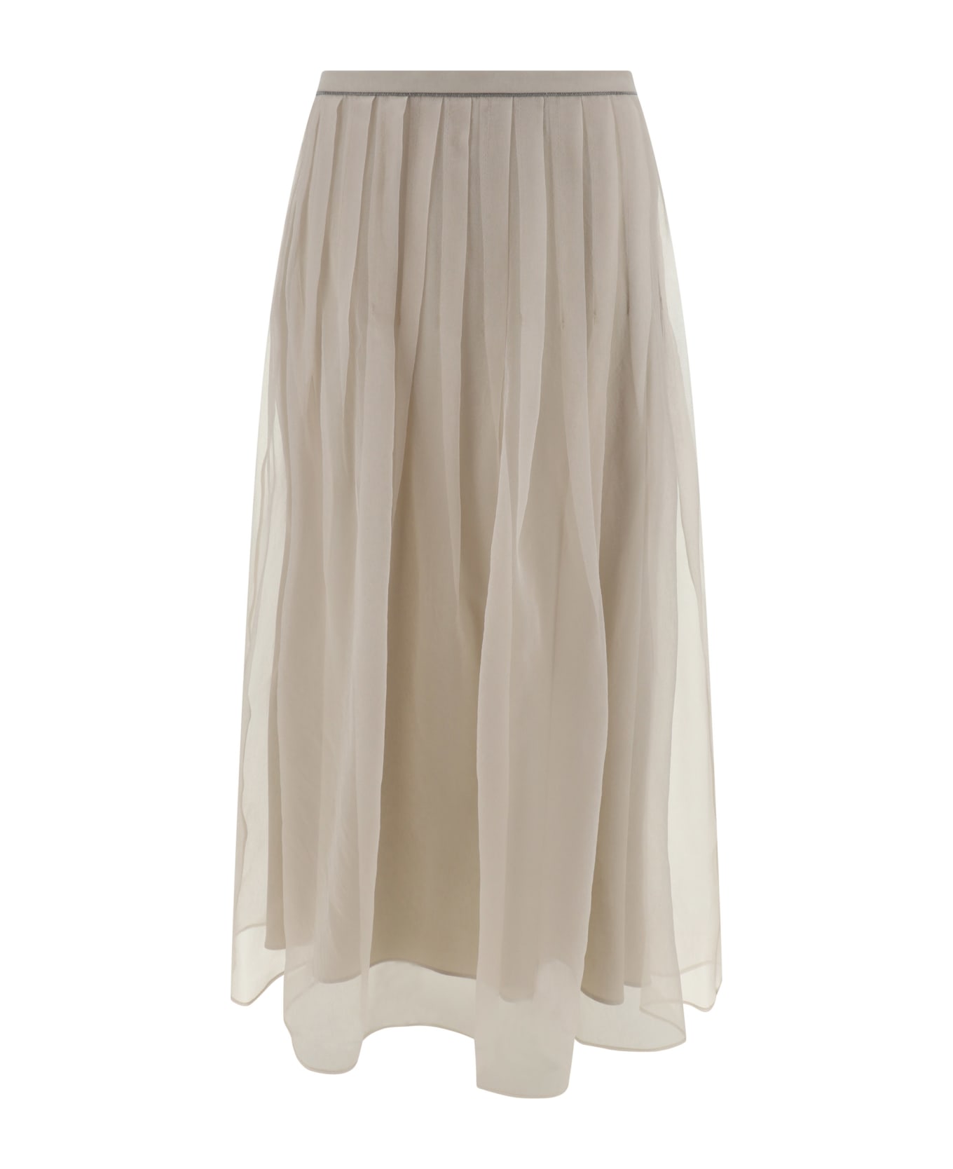 Silk midi skirt by brunello cucinelli, pleated details in the waistline, double layer design, model with opaque petticoat, side zip closure, monochrome pattern. Composition: 100% % Silk