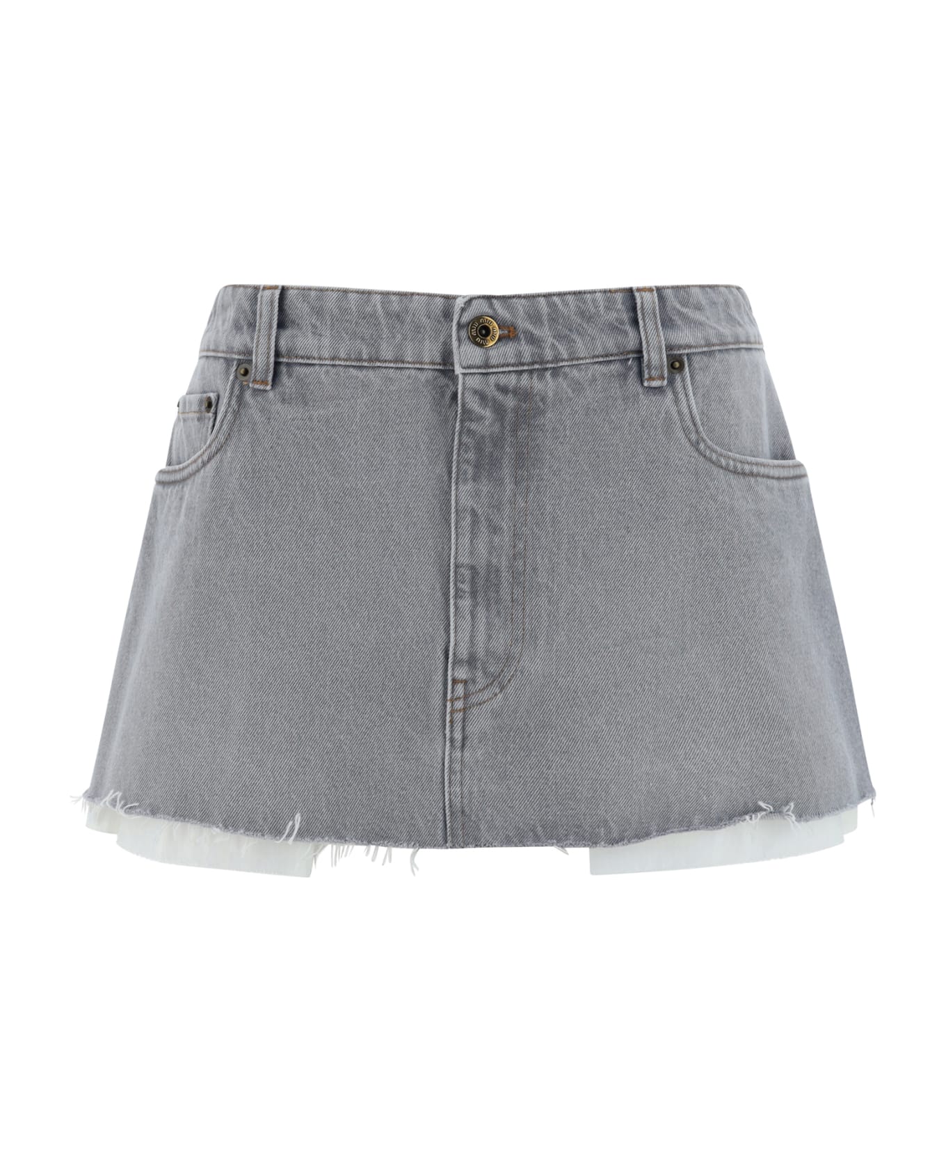Cotton mini skirt by miu miu, denim design, five-pocket style, waistband loops, slightly frayed hem, front button and zipper closure, iconic brand monogram embossed at back. Composition: 100% % Cotton