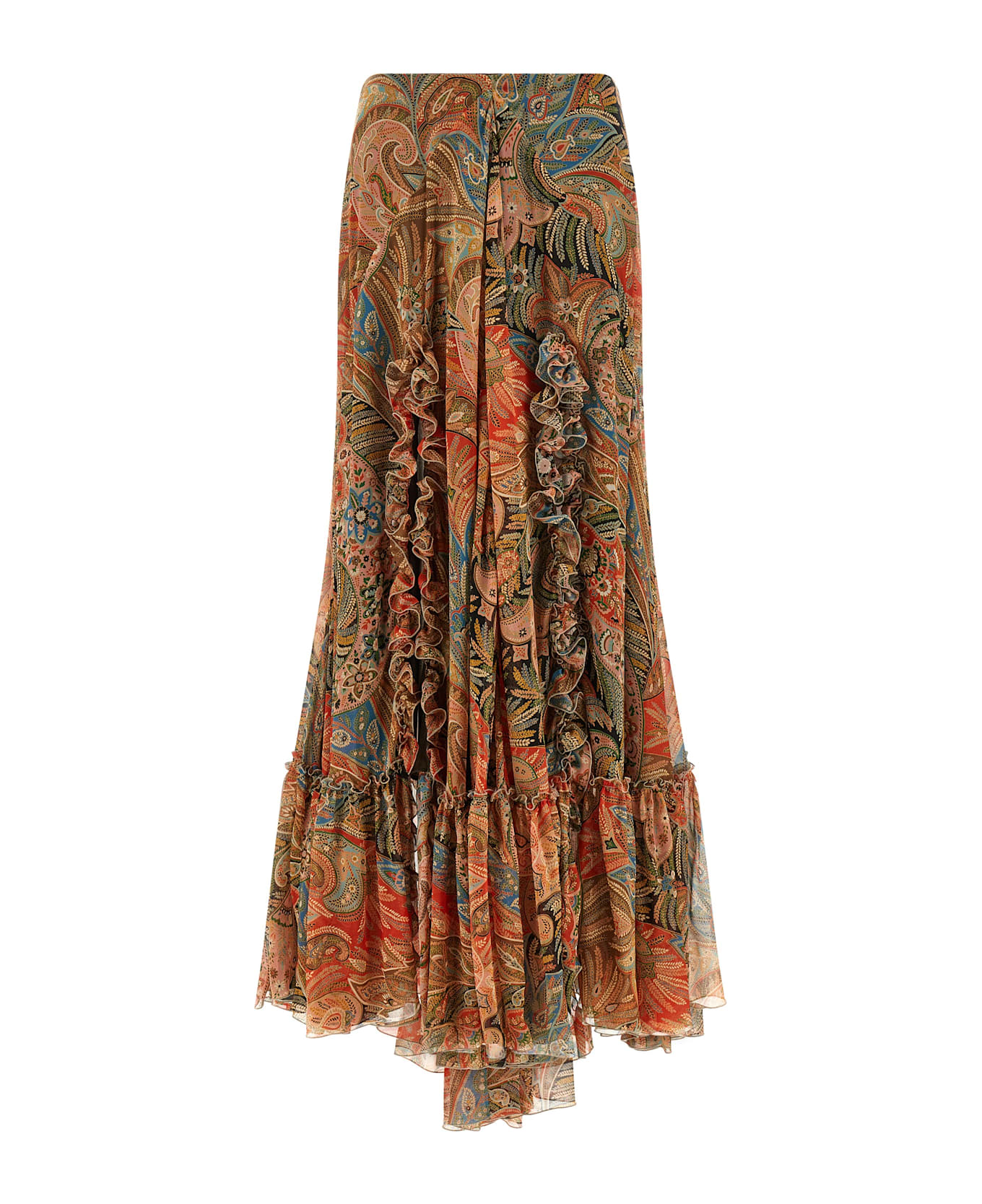 Long skirt in light silk chiffon with paisley foliage and floral pattern, high waist, deep ruffles side slits, flounce on the hem, back zip closure, lining. Composition: 100% silk