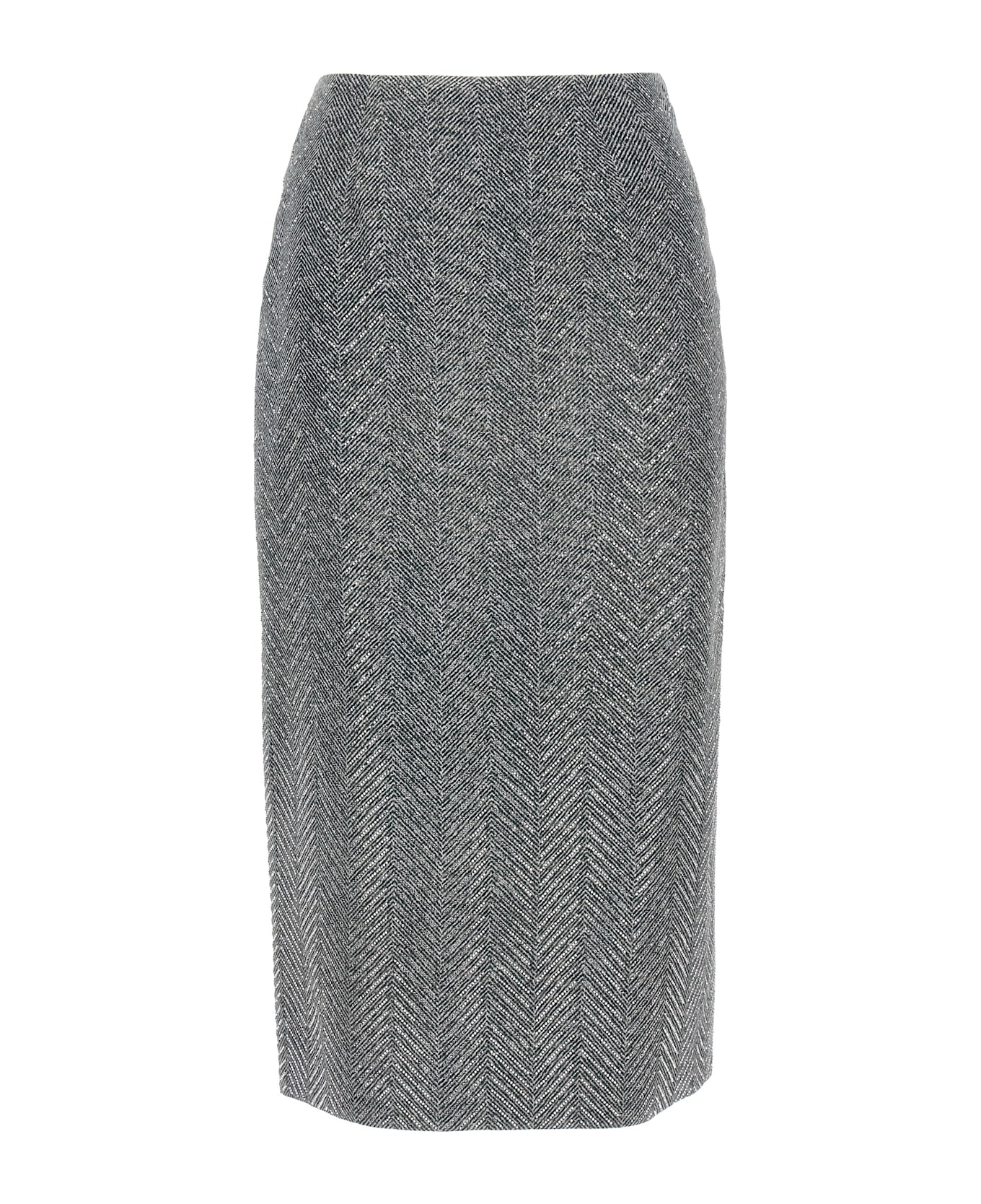 Midi skirt in herringbone patterned silk with all-over rhinestone application, zip closure, back split, lining.