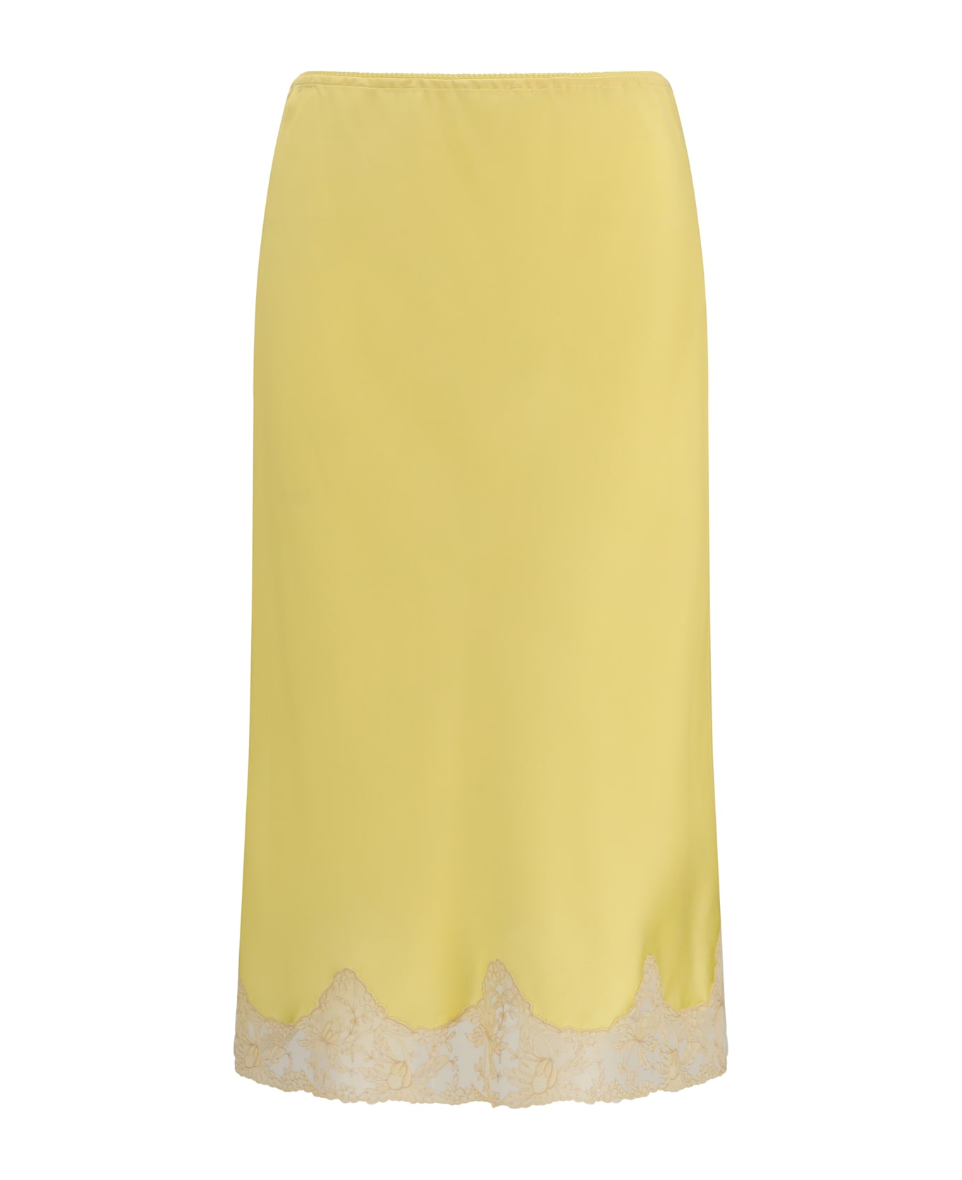 The satin midi skirt with lace inserts, high elasticated waist and straight hem by saint laurent embodies classic elegance with refined sophistication. the fluid satin texture enhances the silhouette with subtle shine and movement, while lace inserts add a delicate feminine touch. the midi length creates balanced proportions, making this skirt by saint laurent a versatile and polished choice for elegant contemporary styling.