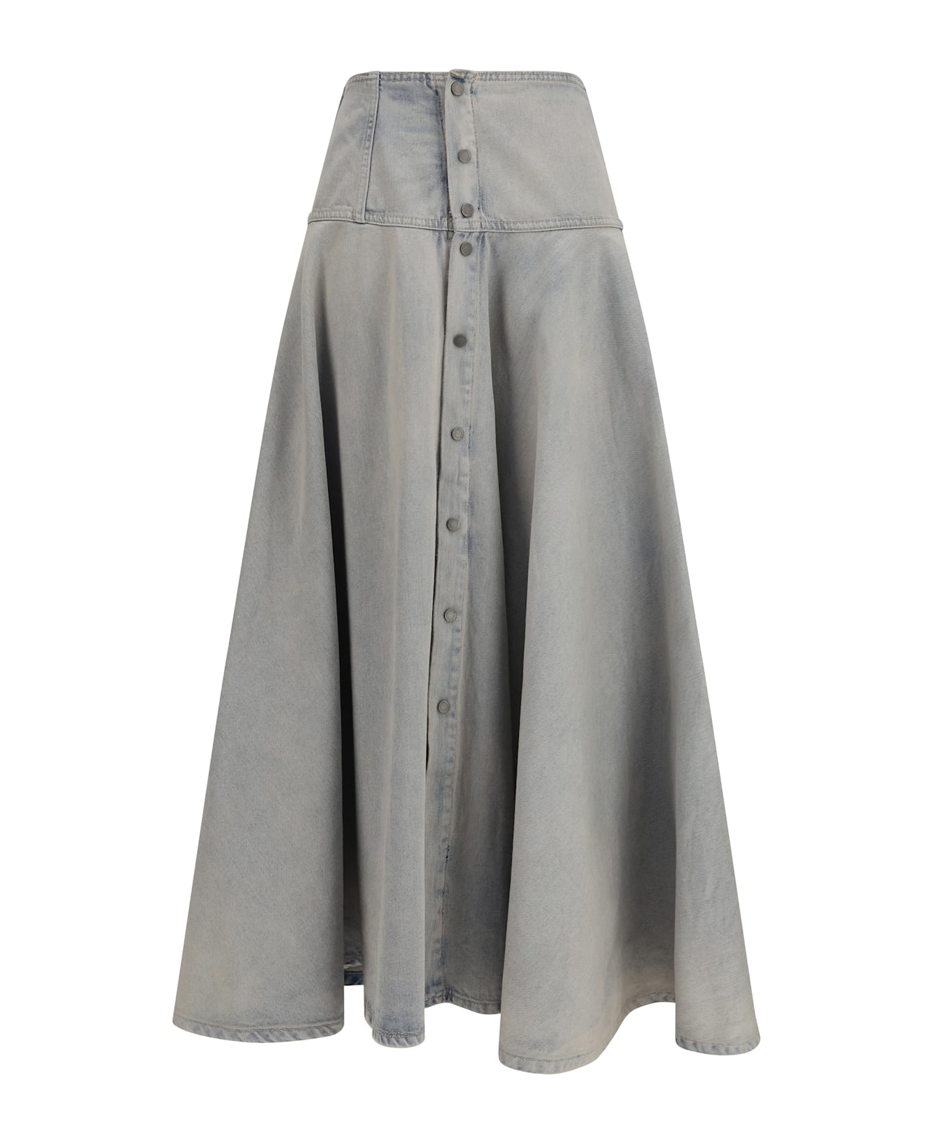 The thea light space skirt by haikure stands out for a wide and contemporary silhouette that interprets denim with a modern aesthetic. the skirt model by haikure features a high waist and midi length that define the silhouette. the front button closure adds a functional and distinctive detail. the haikure thea light space skirt completes the design with a casual and sophisticated style.