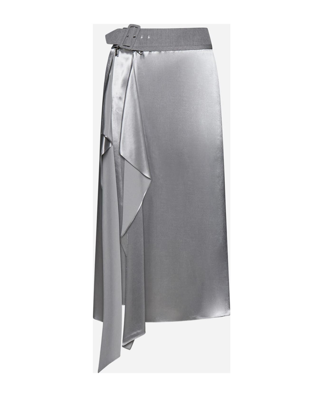 Fendi's grey viscose satin midi skirt featuring a gabardine waistband with rectangular buckle, draped and asymmetric side panel adjustable and detachable by zip and Fendi O'Lock silver-tone metal zip sliders. Composition: 100% viscose