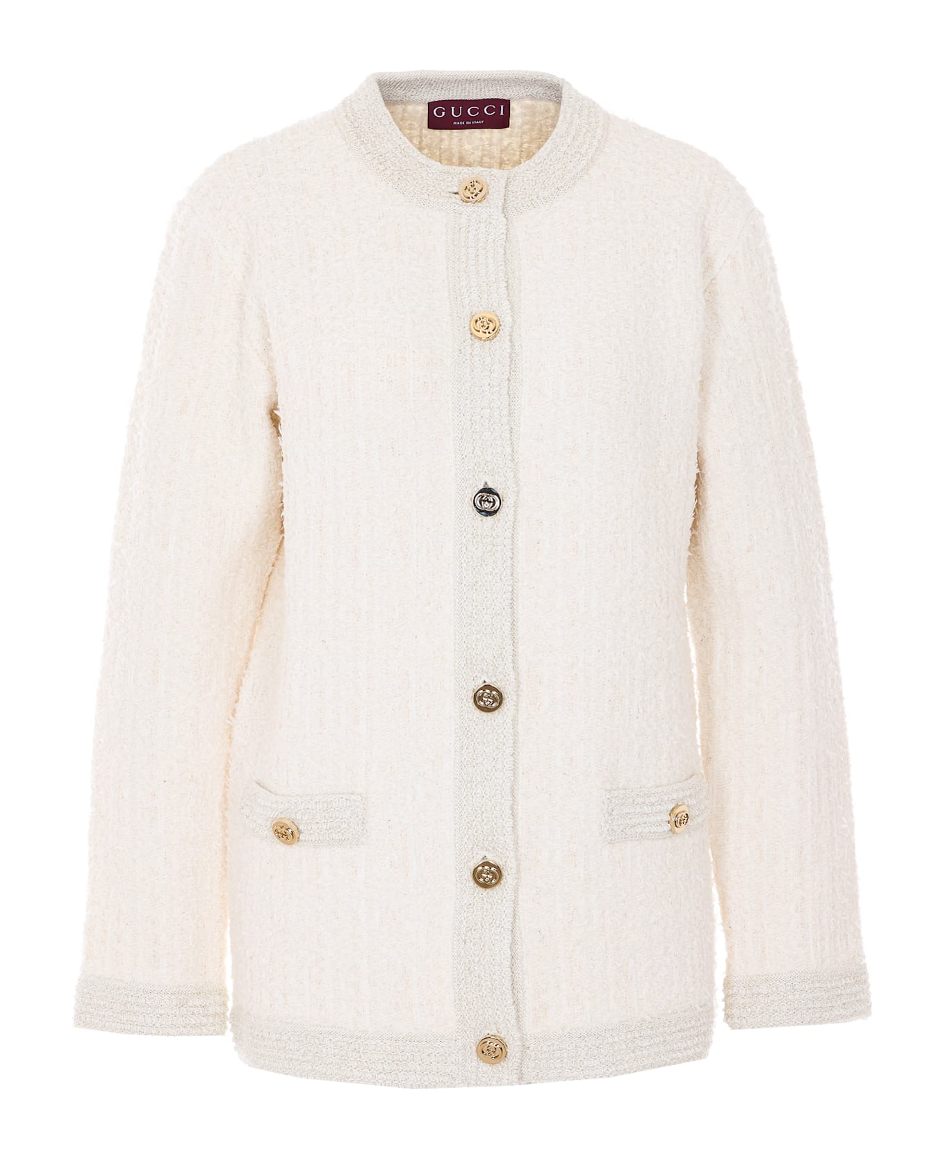 Gucci white boucle' caridgan with frontal logo button closure on the front, long sleeve, crewneck, pockets on the front