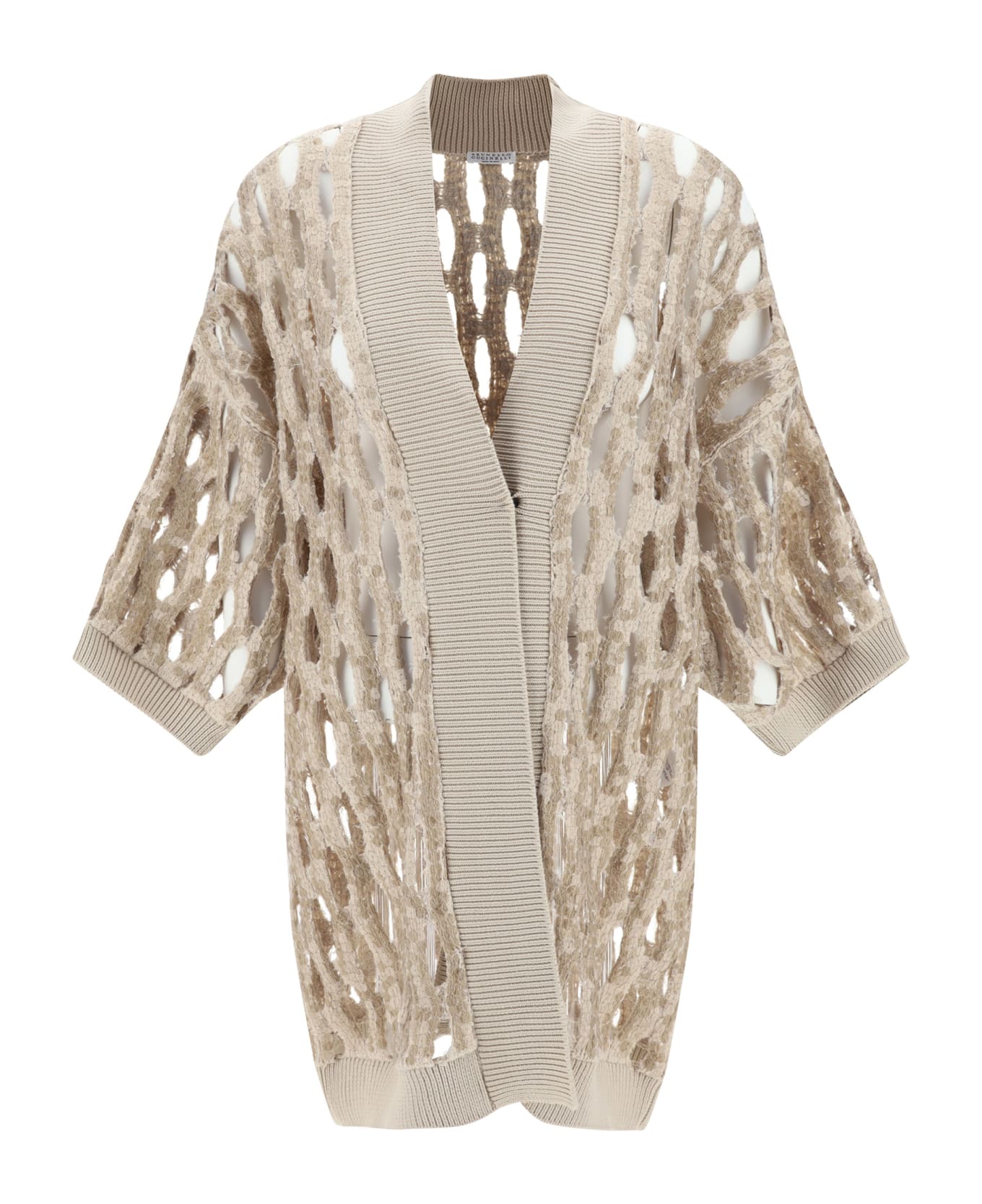 Linen cardigan by brunello cucinelli, knit design embellished with all-over appliqué shiny sequins, elastic ribbed trim, three-quarter length sleeves with ribbed cuffs, concealed button front closure, all-over drop cut-out details, monochrome pattern, regular fit.