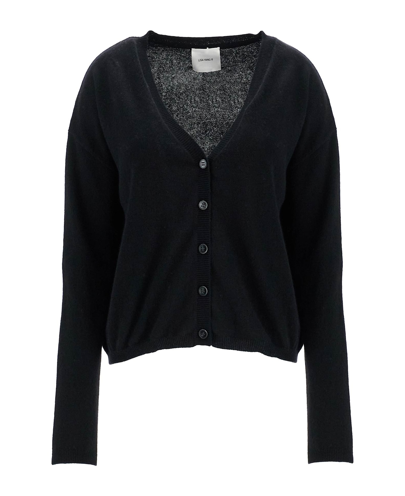 The Abby cardigan by Lisa Yang is made of pure cashmere knit with a classic V-neckline and front button closure. It has a soft and short fit with dropped shoulder sleeves. The model is 177 cm tall and wears size 0.