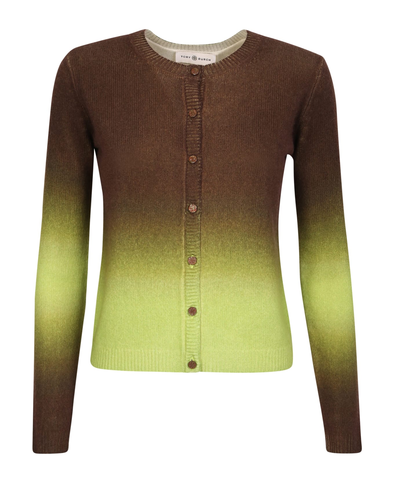 Roundneck. Long sleeves. Front button fastening. Knitted construction. Gradient effect. Ribbed trim. Straight hem. Color: brown/ fluorescent green