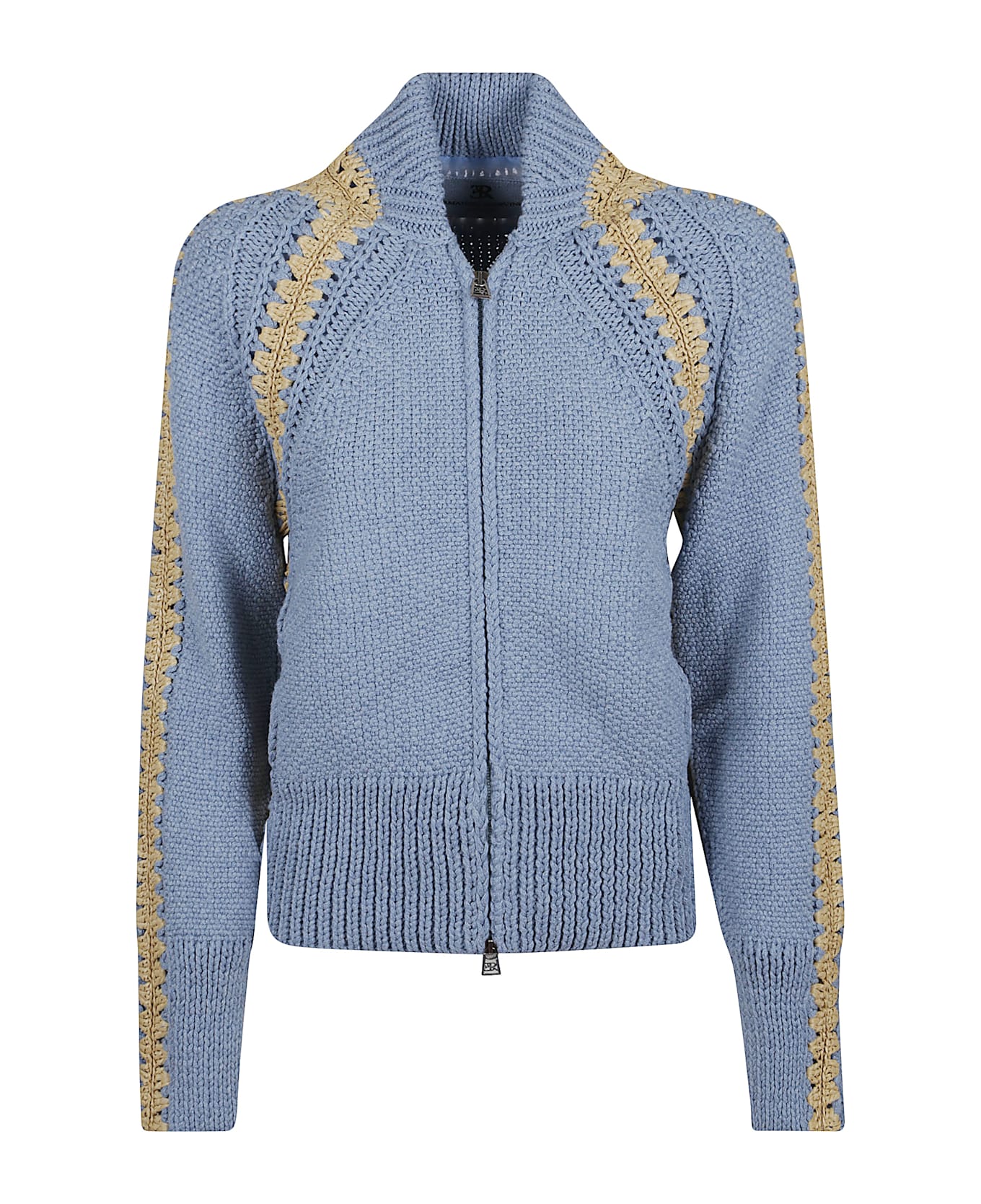LIGHT BLUE JACKET with raffia trim two-way zip on the front two side pockets with slits long sleeves ribbed edges