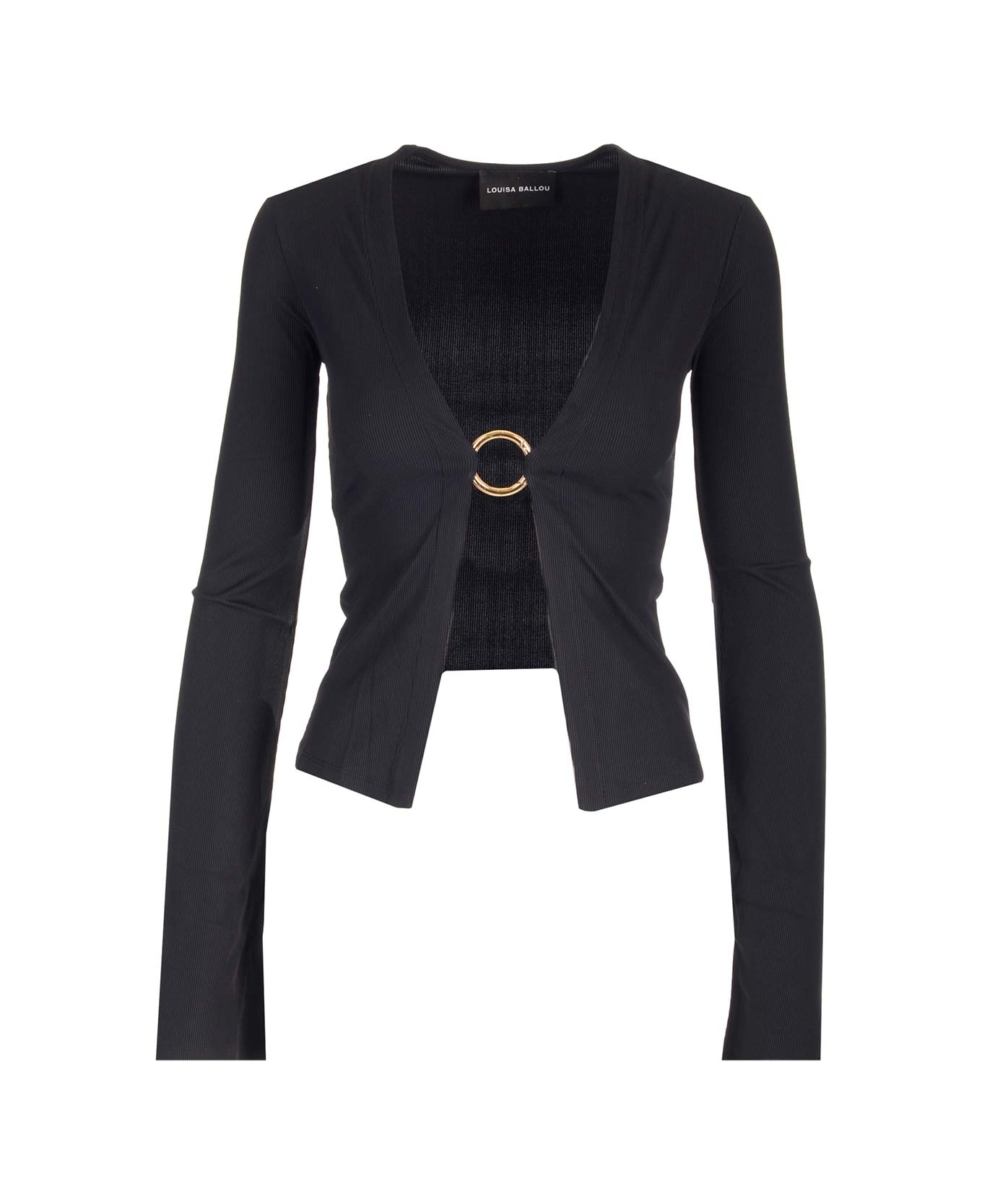 Ribbed stretch jersey cardigan from Louisa Ballou, with ring detail, bell sleeves, slim fit.