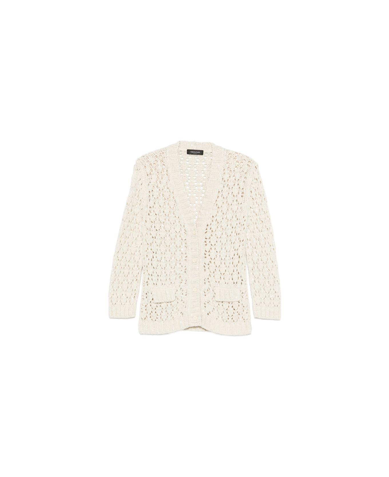beige openwork knit front button fastening two front patch pockets V-neck long sleeves
