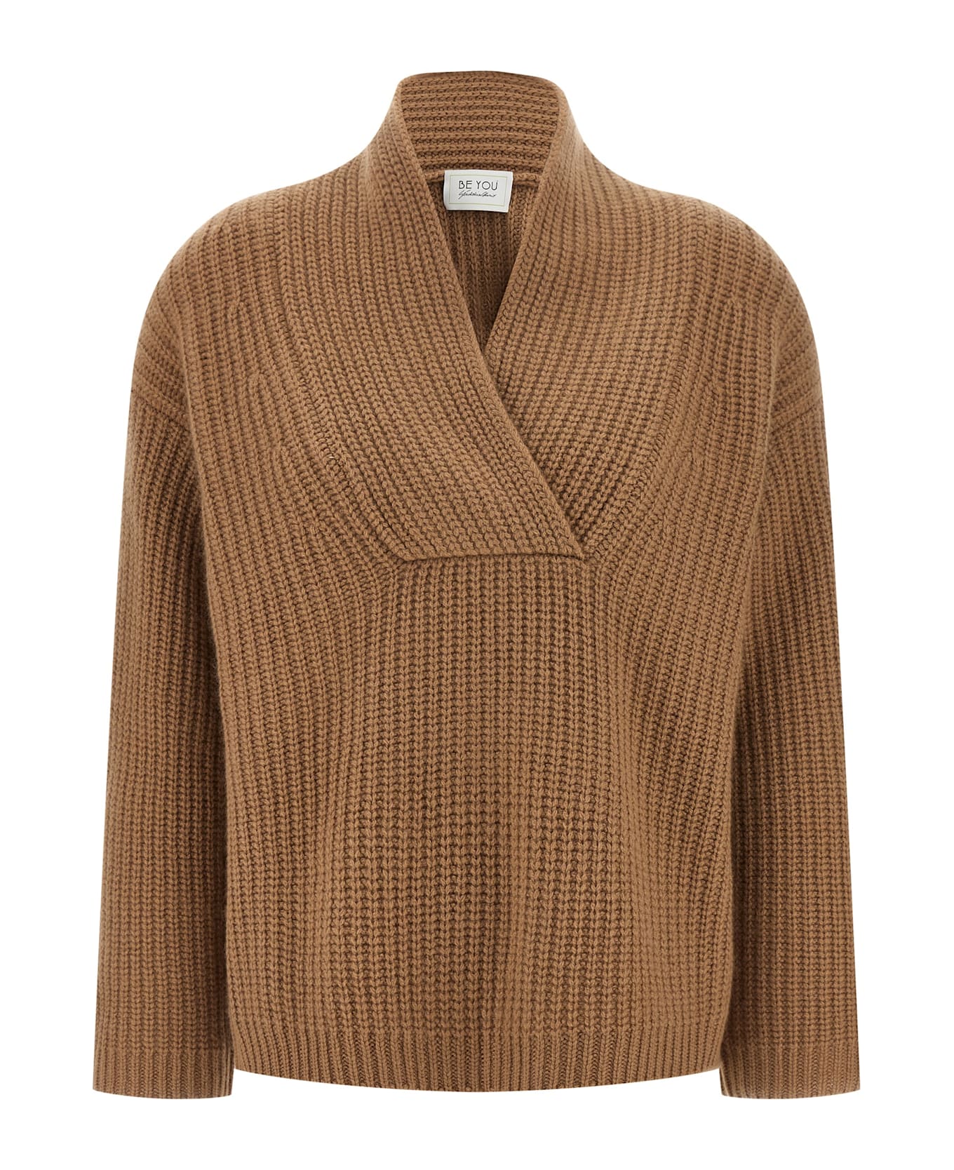 Knitted cashmere sweater with shawl collar, long sleeves with dropped shoulders.