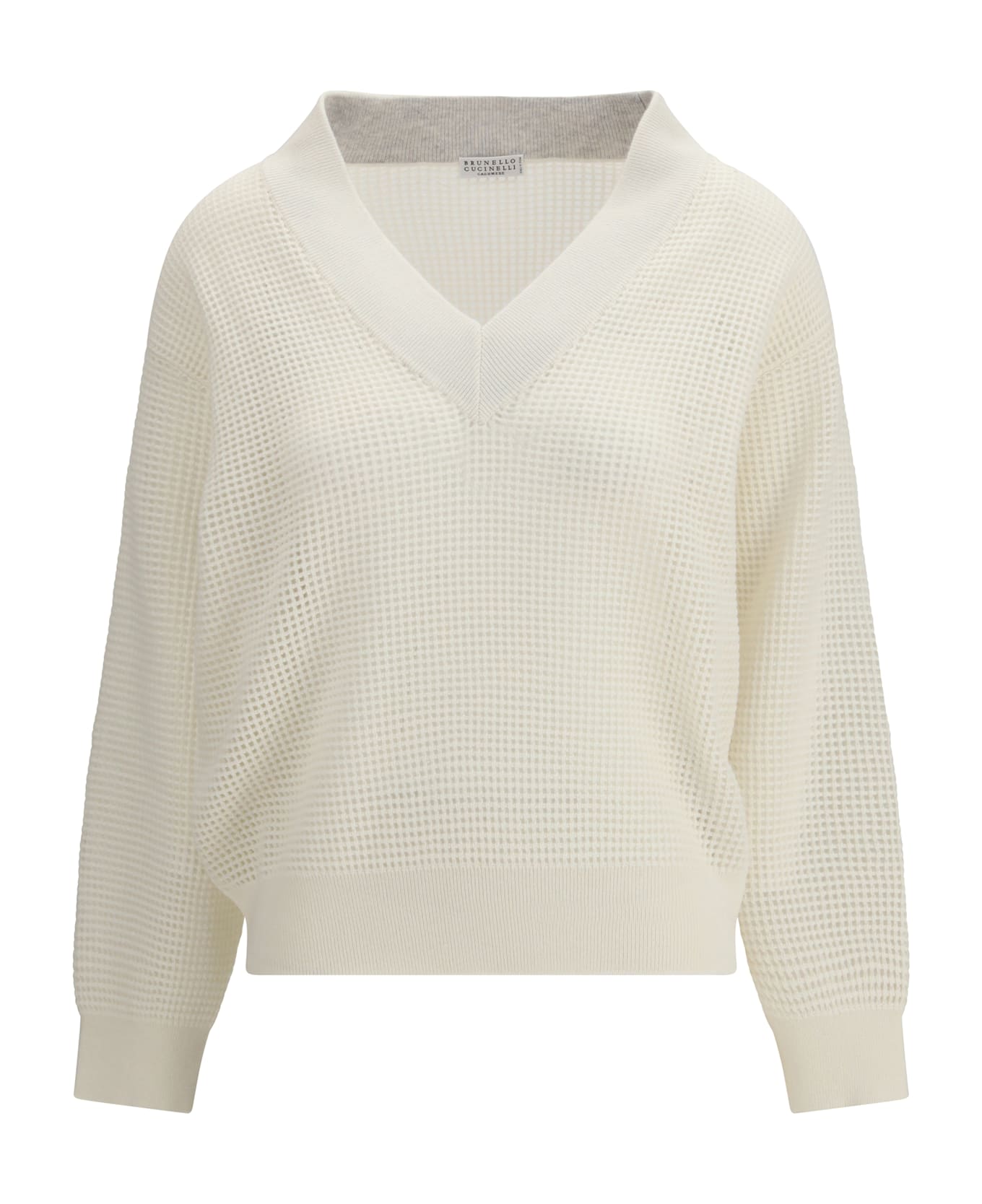 The cashmere net sweater by brunello cucinelli embodies a soft, luminous femininity, defined by the perfect balance of lightness, airiness, and a naturally enveloping feel. the fine cashmere yarn is crafted into an open net stitch, creating a refined interplay of texture, transparency, and movement. its relaxed silhouette is enhanced by dropped shoulders and wide sleeves, while the ribbed v-neckline adds a touch of understated elegance. finished with rib-knit cuffs and hem, this piece elevates knitwear to its most sophisticated and timeless expression.