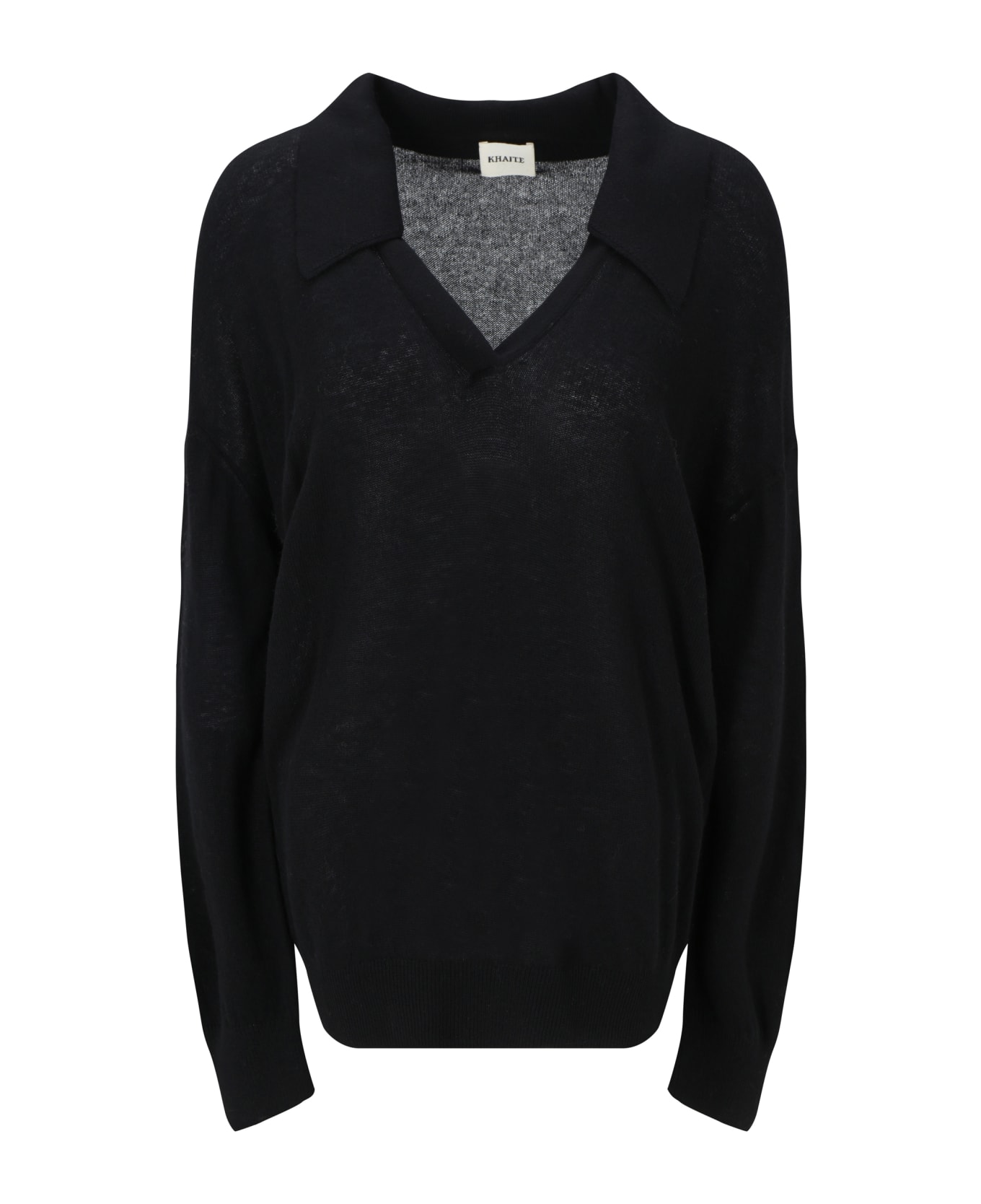 Cashmere elsia sweater by khaite, ribbed front v-neck, classic collar, ribbed cuffs, monochrome design, ribbed hem, oversize fit. Composition: 100% % Kashmir/capra Hircus