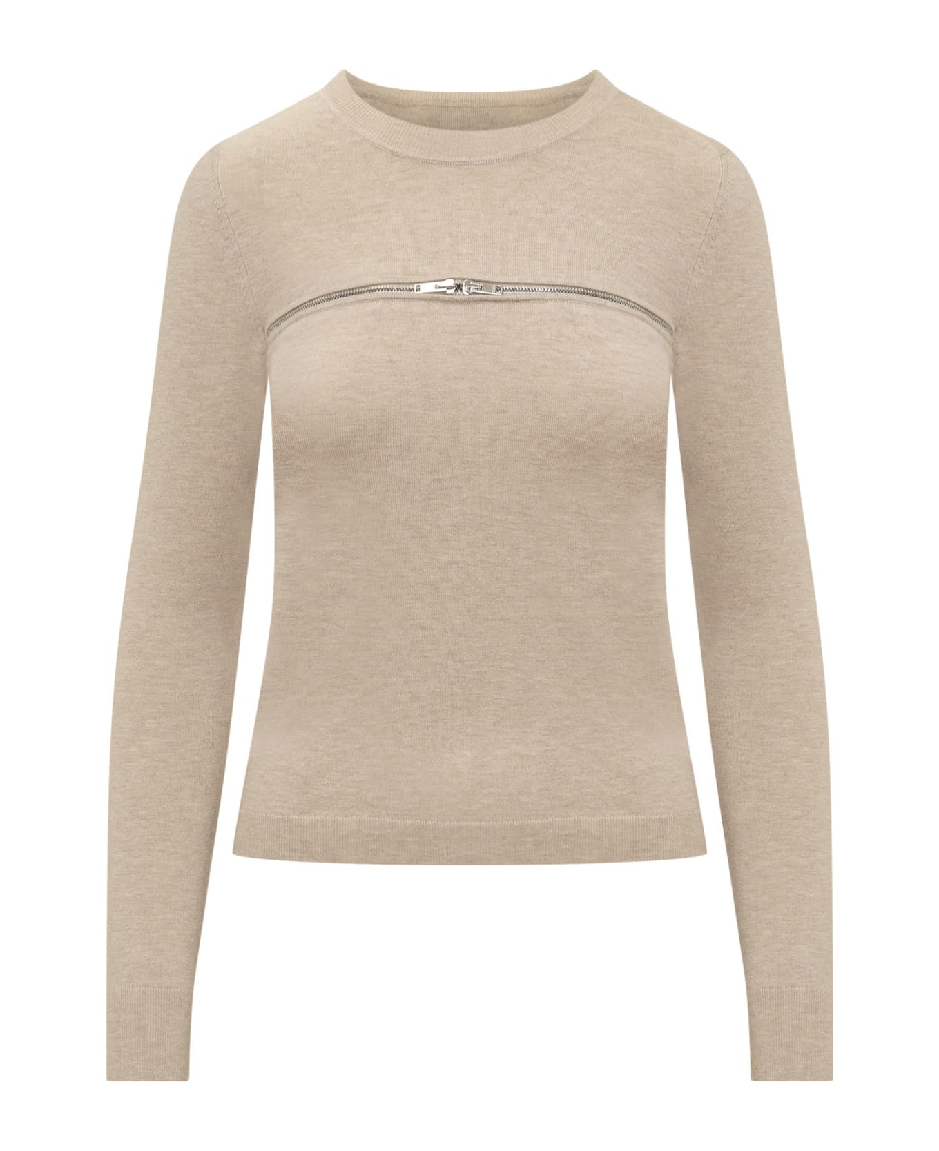 Beige sweater with long sleeves. Crew neck. Zip detail on the chest. Ribbed cuffs and bottom.