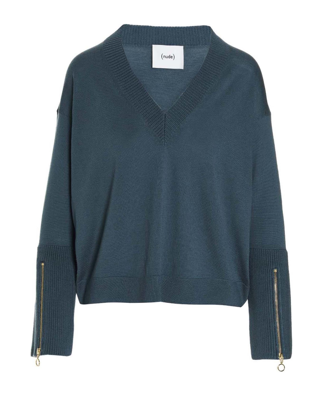 Wool sweater, with a V-neck and sleeves with wide cuffs and zip detailing.
