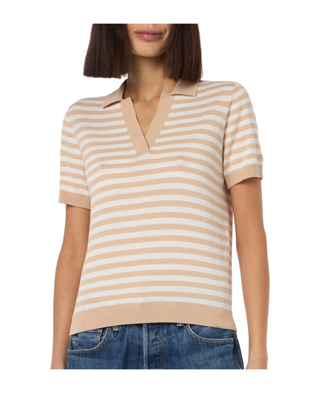 Featuring a classic vintage, these knitted polo is designed with a mid elasticated rise and a fitting silhouette, made to hit at the waist. Cotton knitted polo shirt Beige and white striped print Elasticated waistband Shorts sleeves Regular fit True to size Composition: 100% Cotton