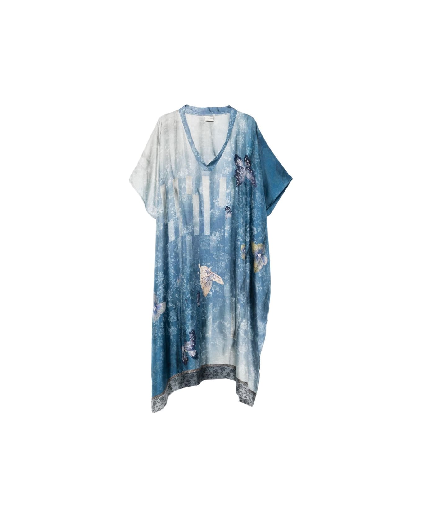 blue and multicolour floral print butterfly print V-neck short sleeves border print
