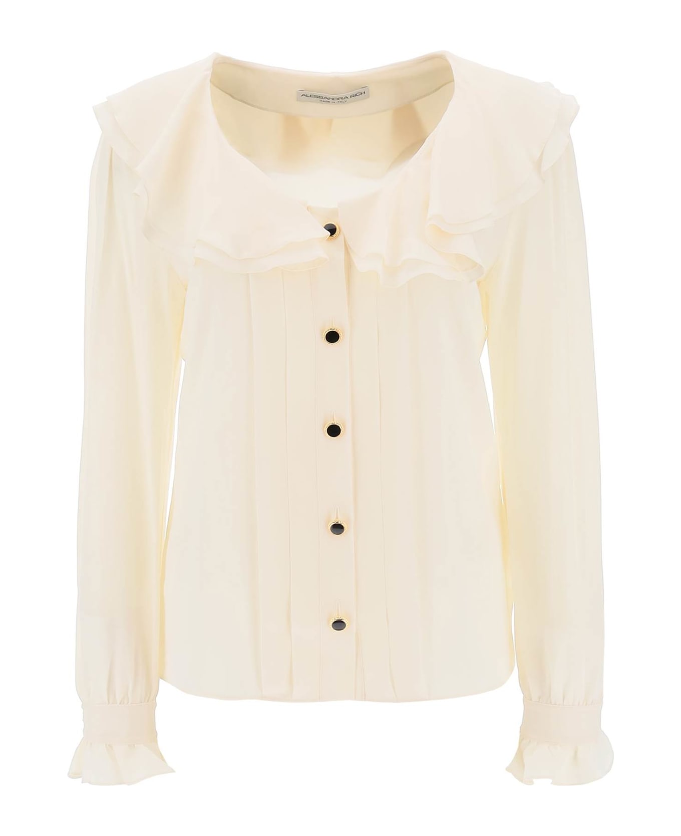 Alessandra Rich blouse made from pure silk crepe de chine with scoop neck adorned by frills. It features front closure with glazed gold-tone metal buttons enriched by pleats and long puff sleeves with ruffled cuffs. Relaxed fit. The model is 177 cm tall and wears size IT 40.